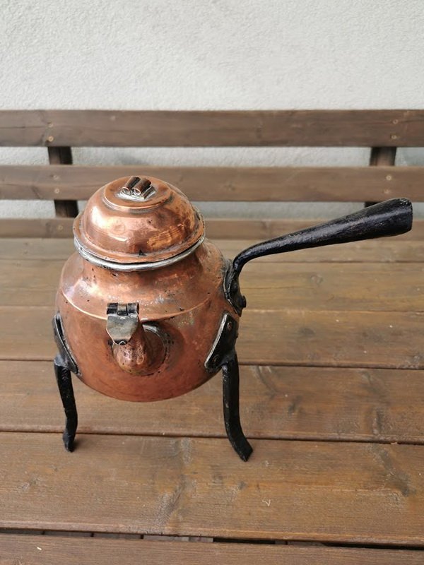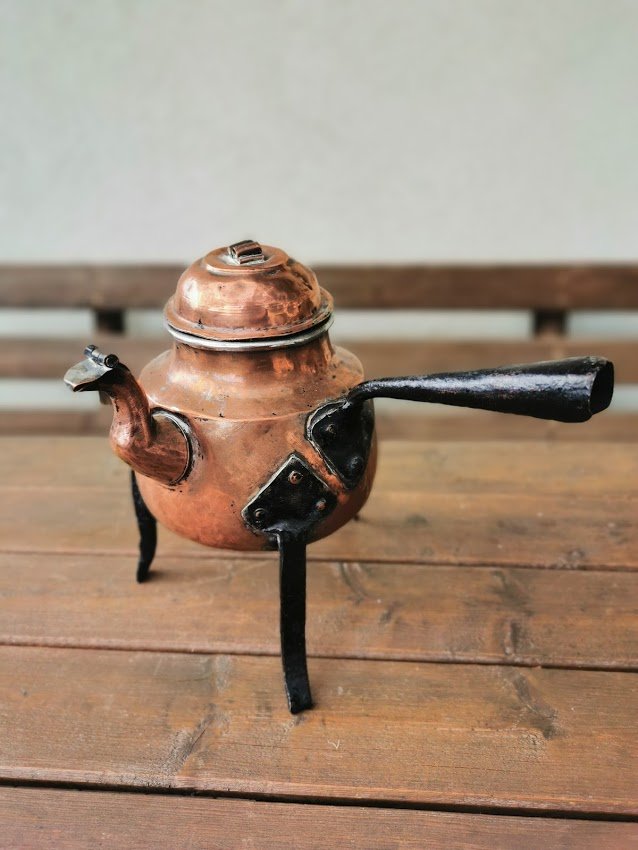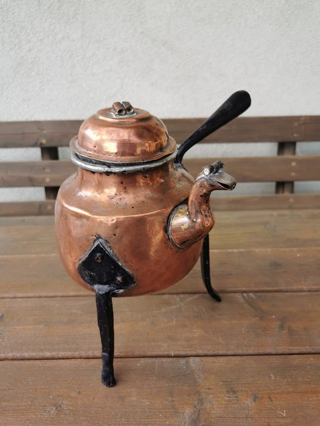 Indas, arbatinukas antikvarinis, trikojis, kaltinis su stovu ir rankena. Ilgis su rankena 30, aukštis 26 cm. Kaina 43