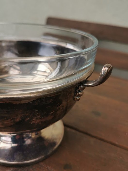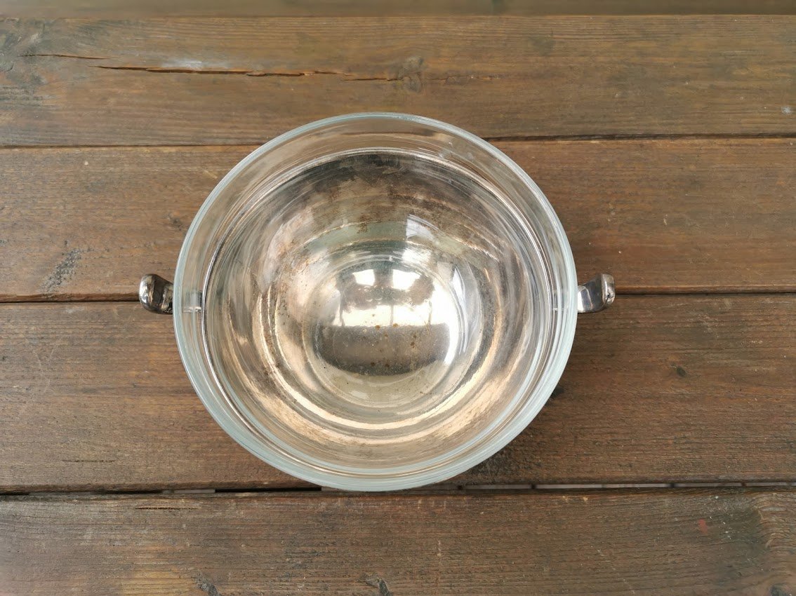 Indas Art Deco su stiklu sidabruotas, antikvarinis. Aukštis 12, skersmuo 14 cm. Kaina 32