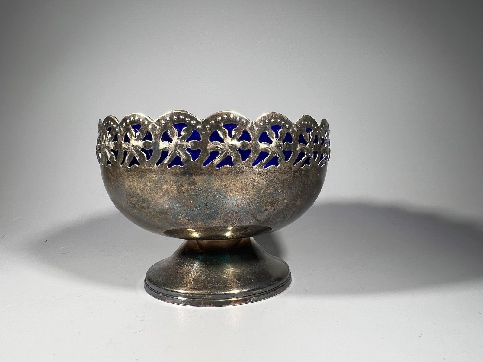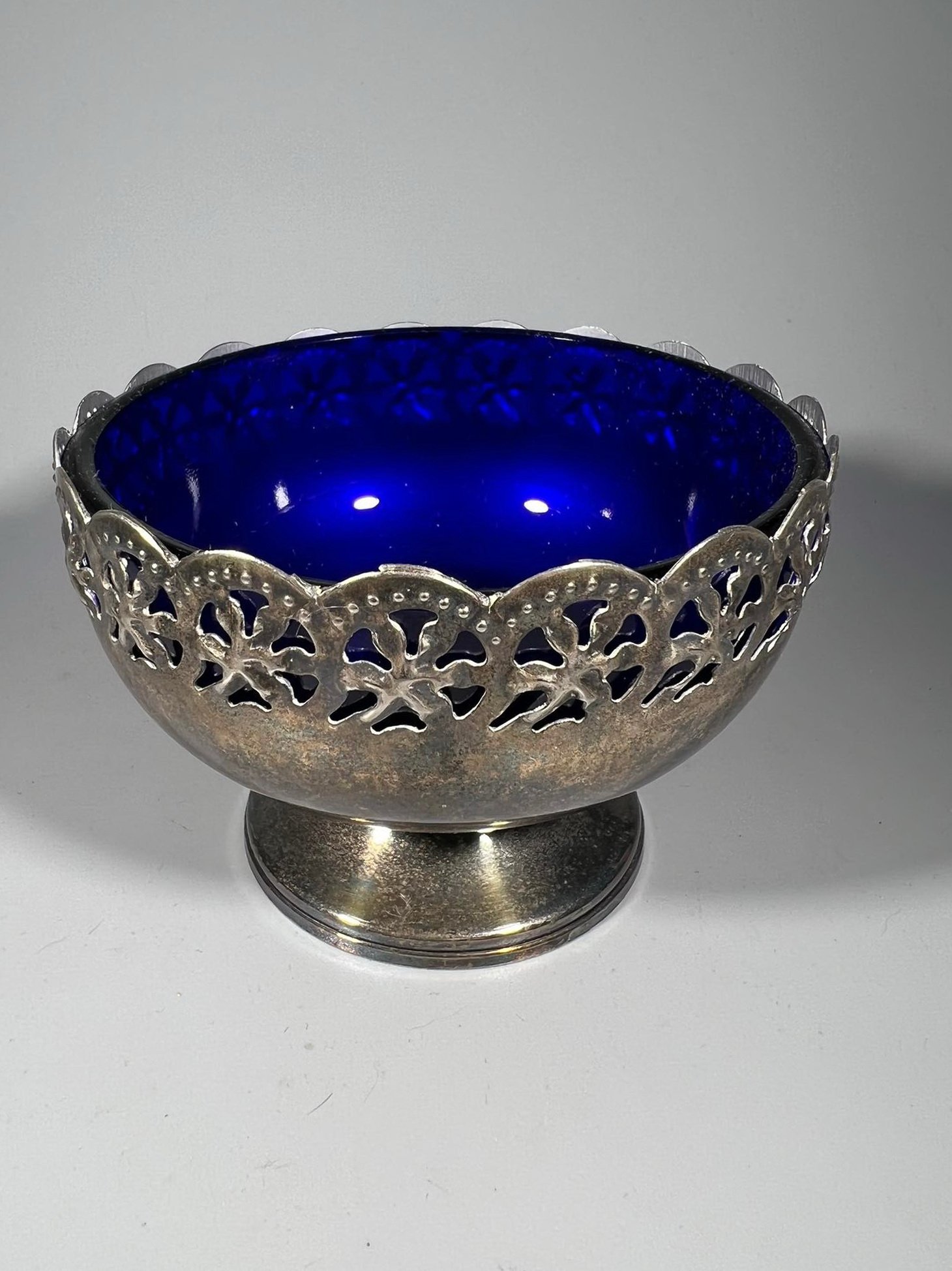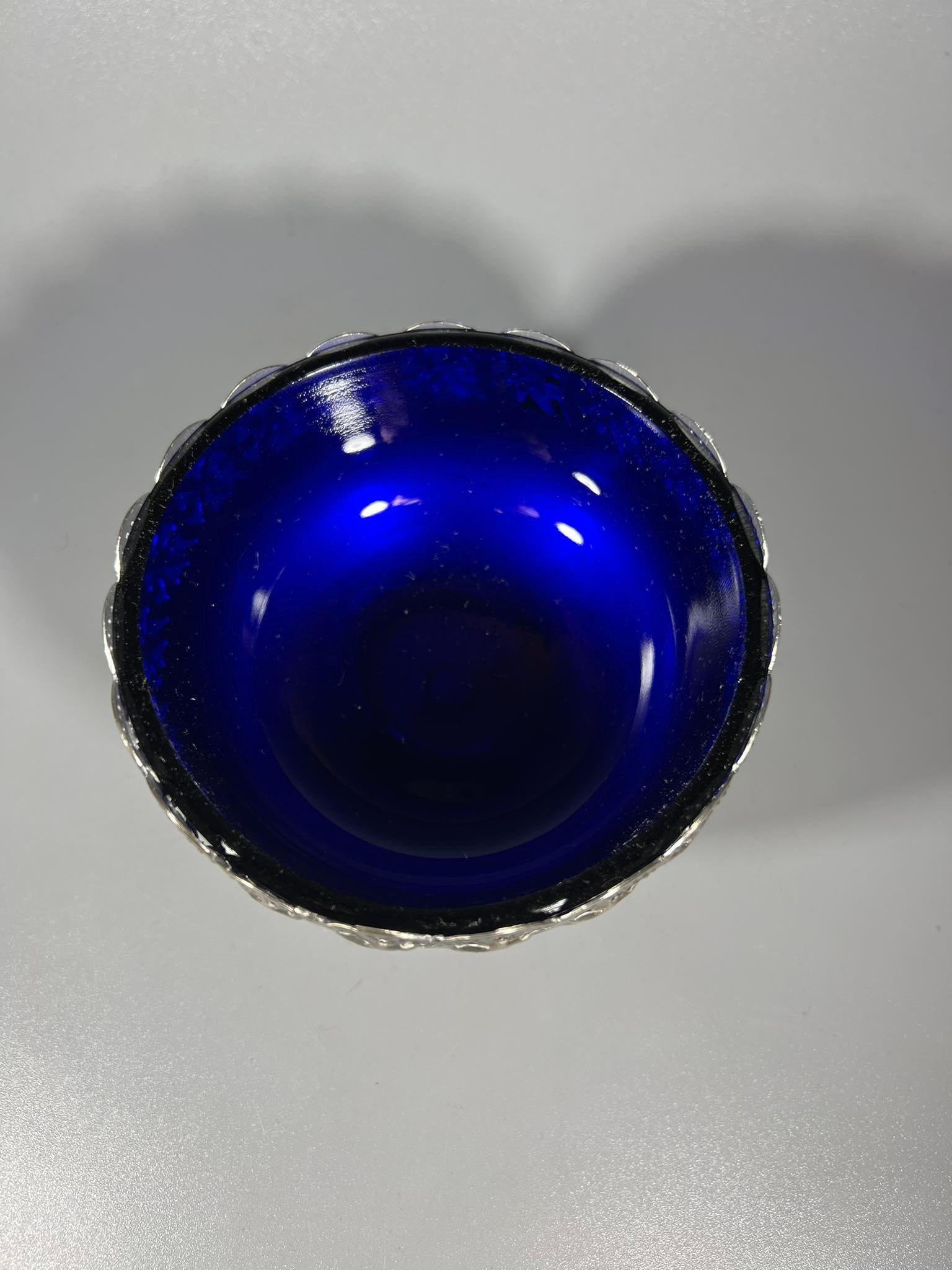 Indas cukrinė mėlynu stiklu, antikvarinė. Made in England. Aukštis 7, skersmuo 10 cm. Kaina 18