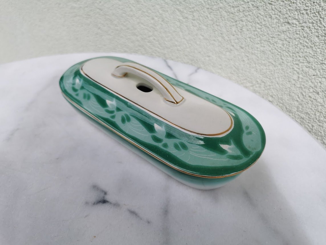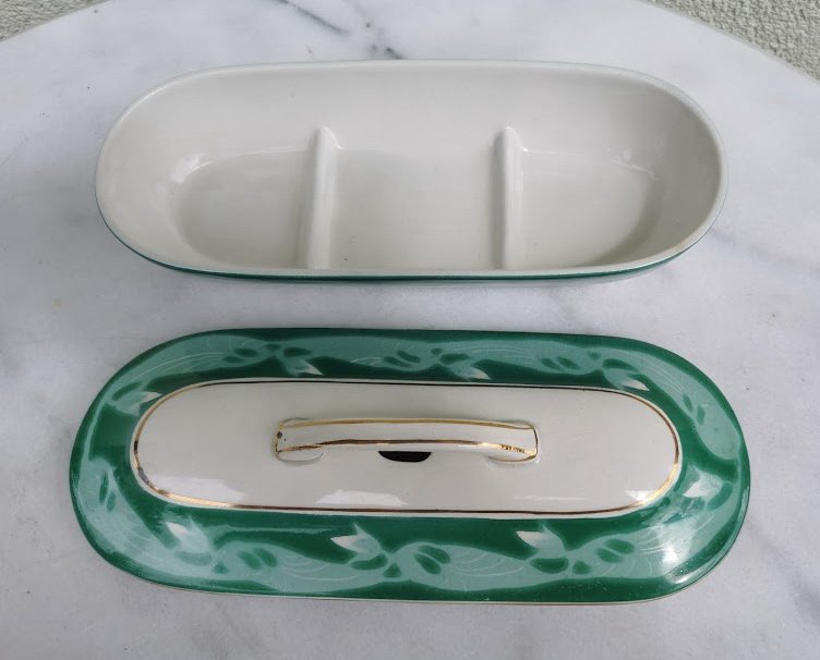 Indas dantų šepetėliams su dangteliu fajanso, antikvarinė. Ilgis 23, plotis 9, aukštis 9 cm. Kaina 33