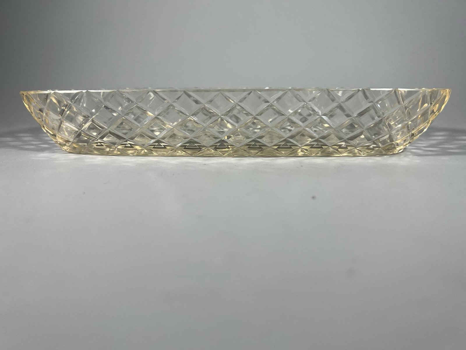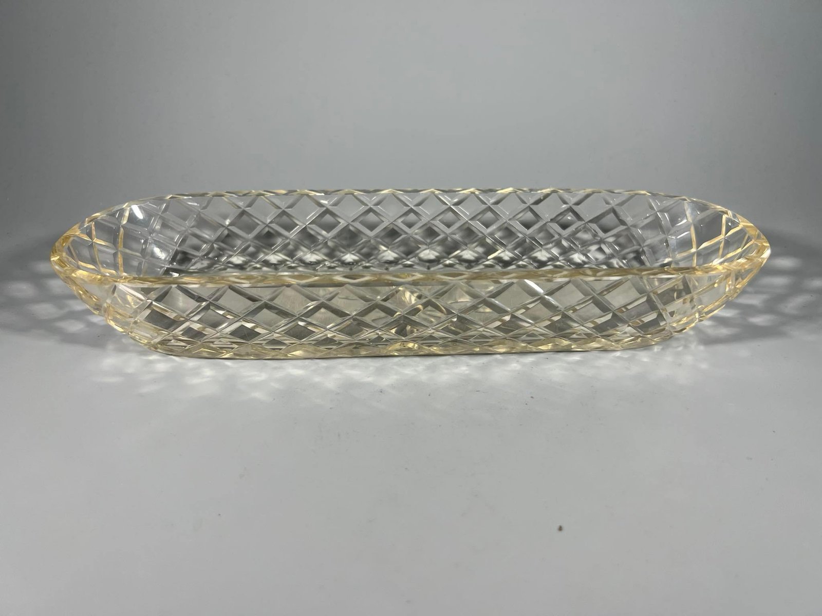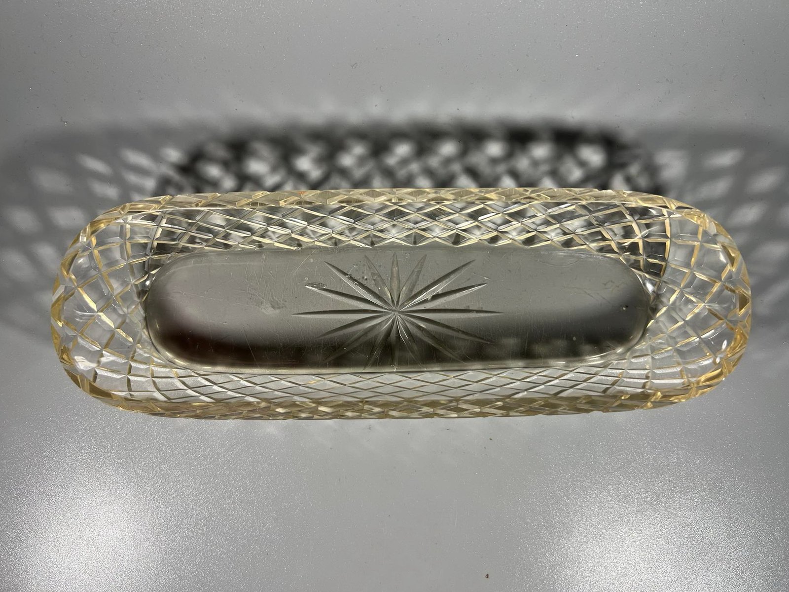 Indas krištolinis, antikvarinis. Ilgis 23,5, plotis 8, aukštis 3,5 cm. Kaina 18