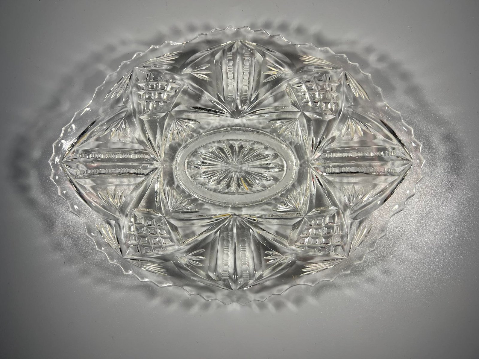 Indas, lėkštė raižyto stiklo, antikvarinė. Aukštis 2,5, ilgis 21, plotis 15,5 cm. Kaina 16