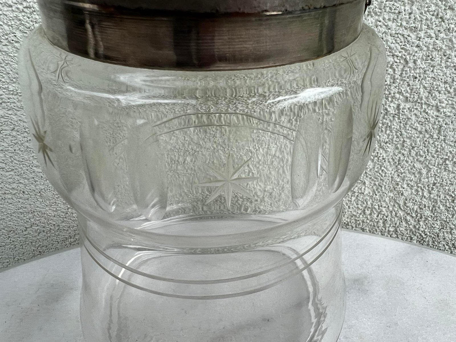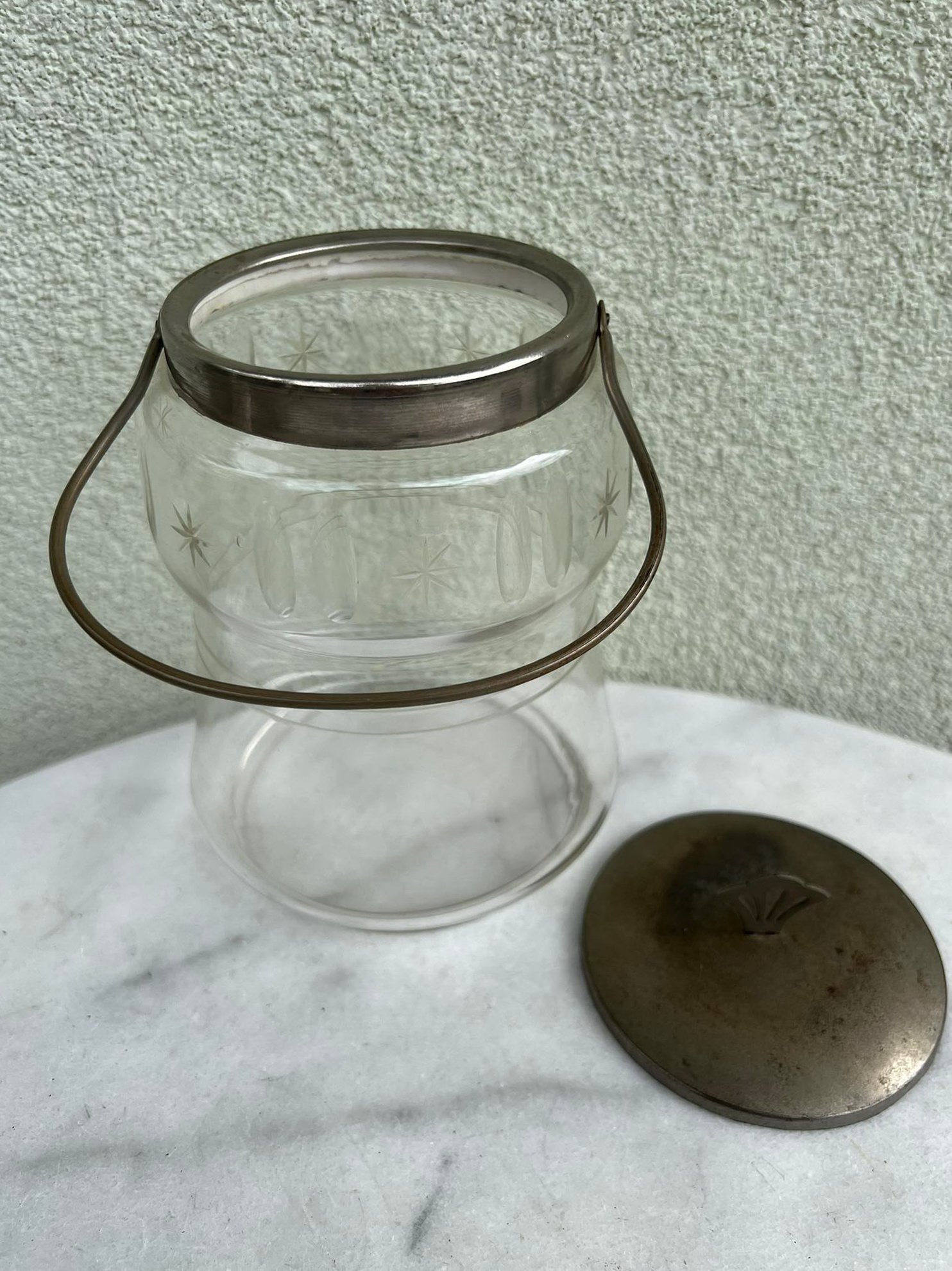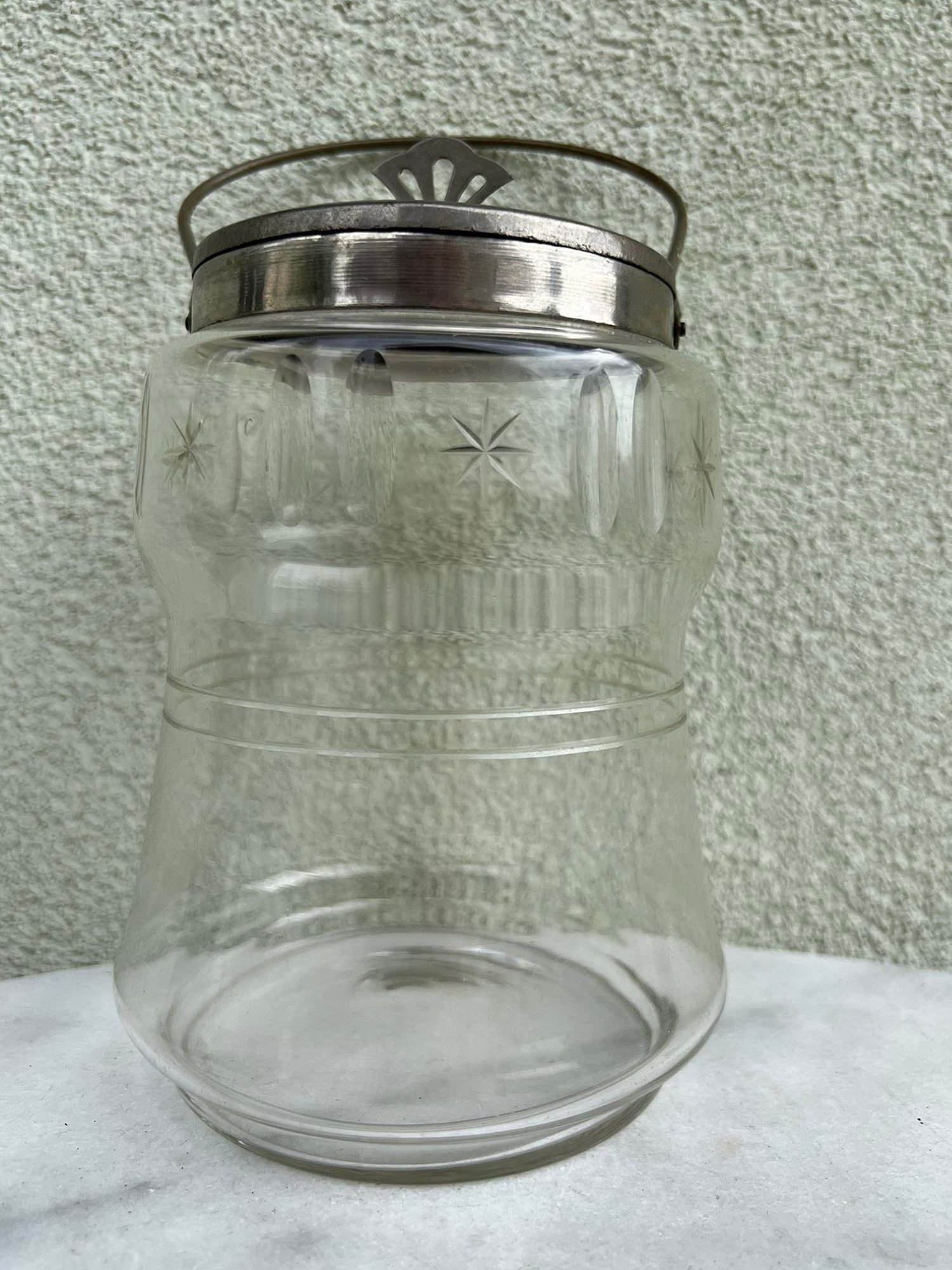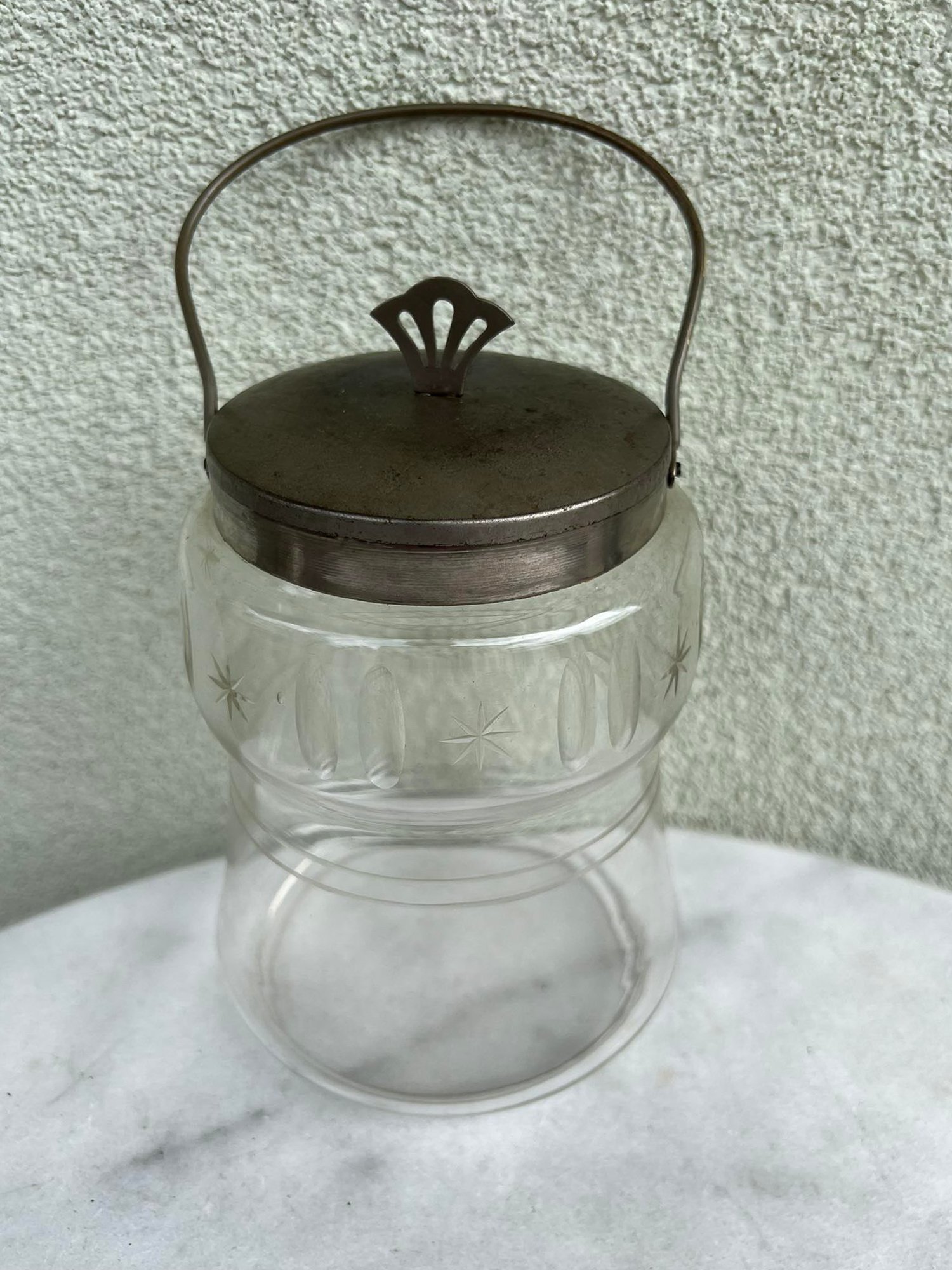 Indas sausainiams antikvarinis, raižyto stiklo. Aukštis be rankenos 18, skersmuo 13 cm. Kaina 33