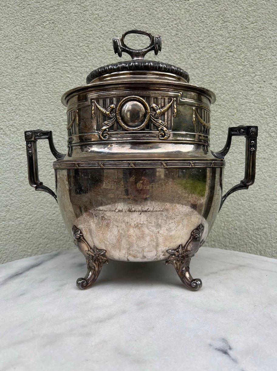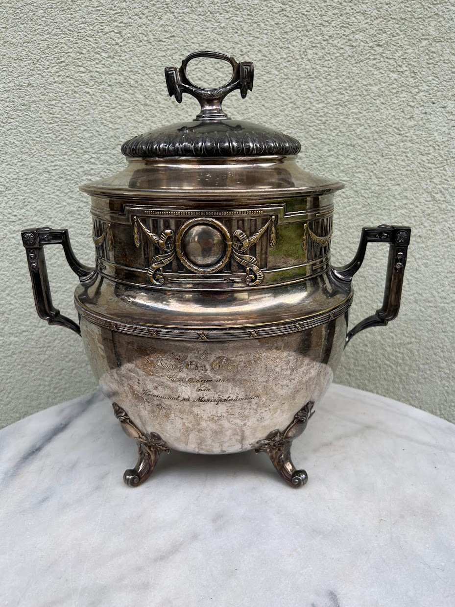 Indas serviravimo, sriubinė, terenas, tereen, sidabruotas, antikvarinis, Art Nouveau stiliaus, 1916 m. Didelis, 38 cm. aukščio. Kaina 168