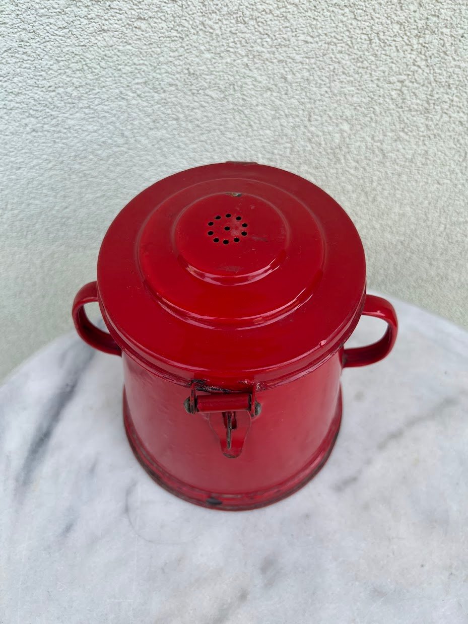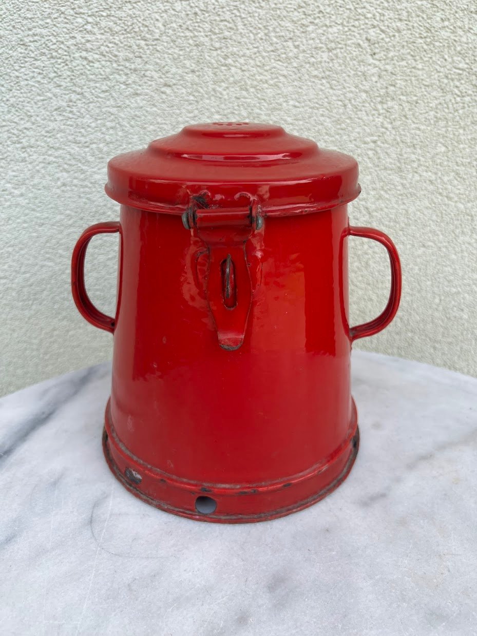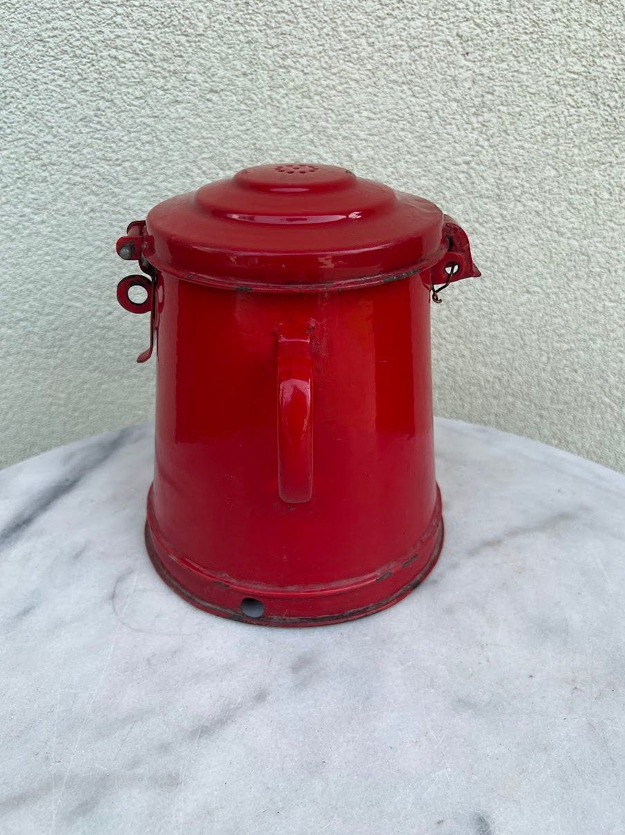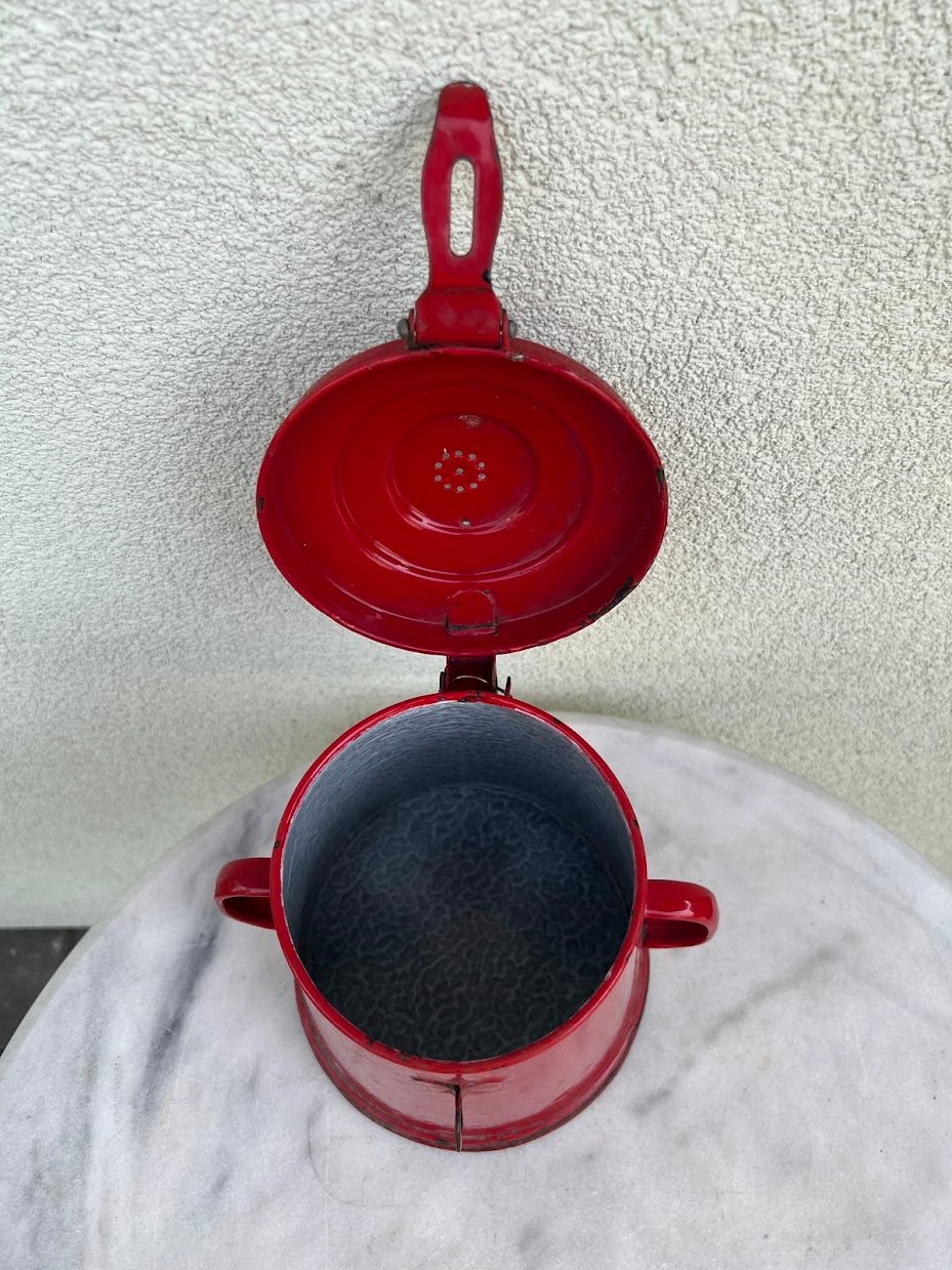 Indas skardinis, emaliuotas, raudonos spalvos maistui, vintažinis, apie 1970 m. Talpa 2 l. Aukštis 21, pagrindo skersmuo 19 cm. Kaina 43