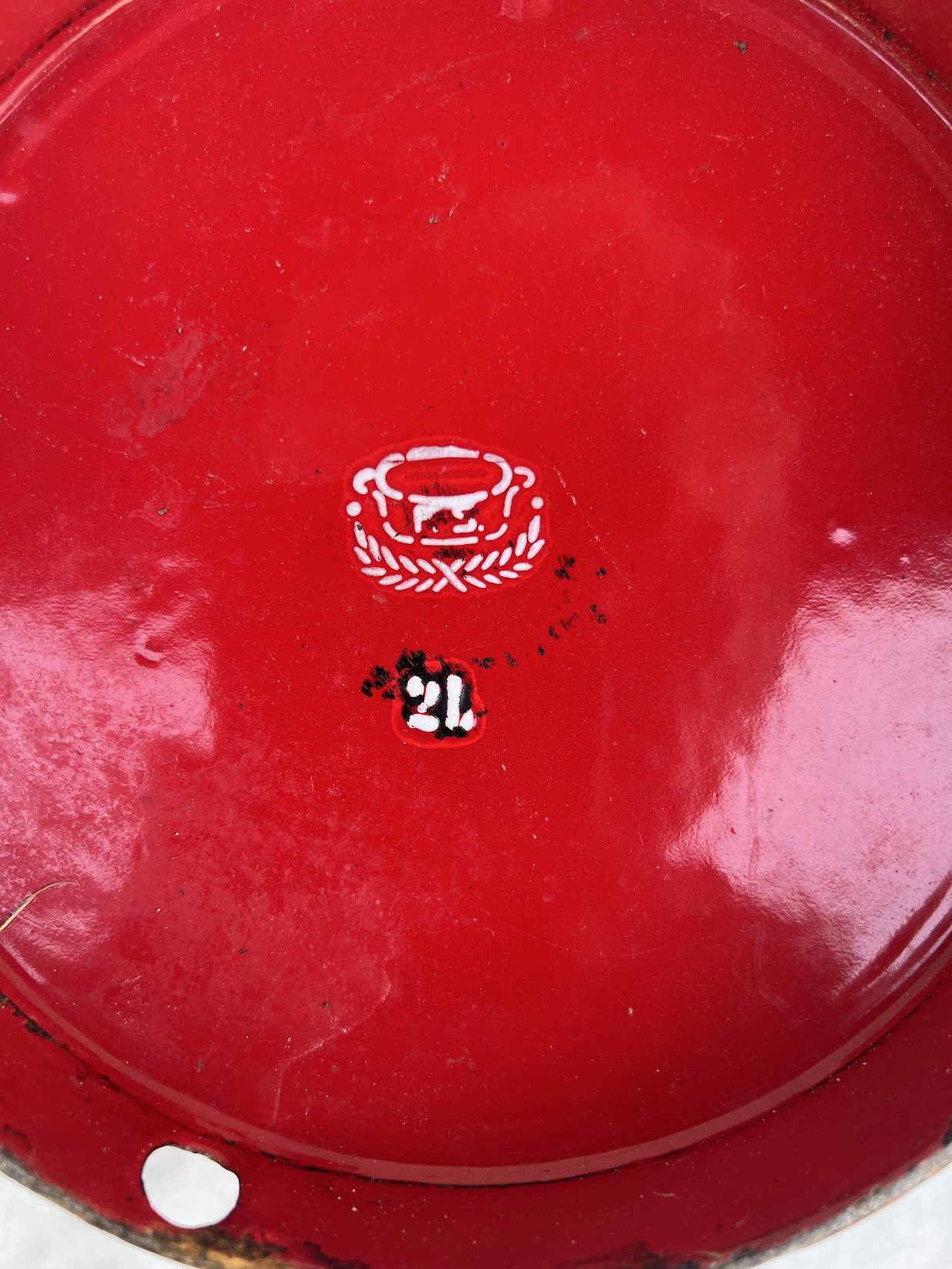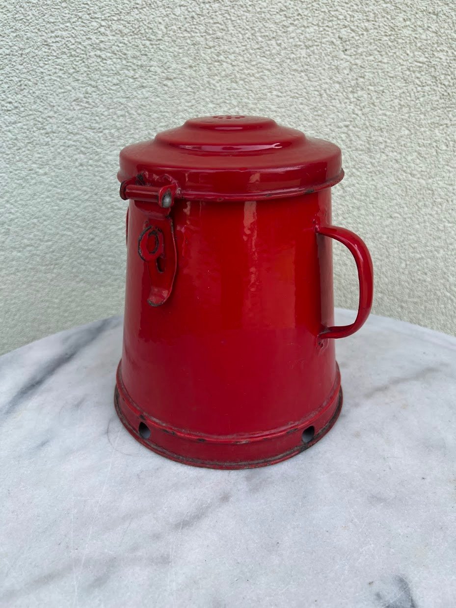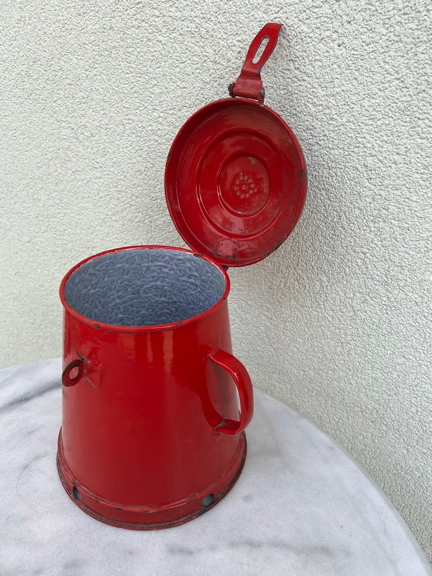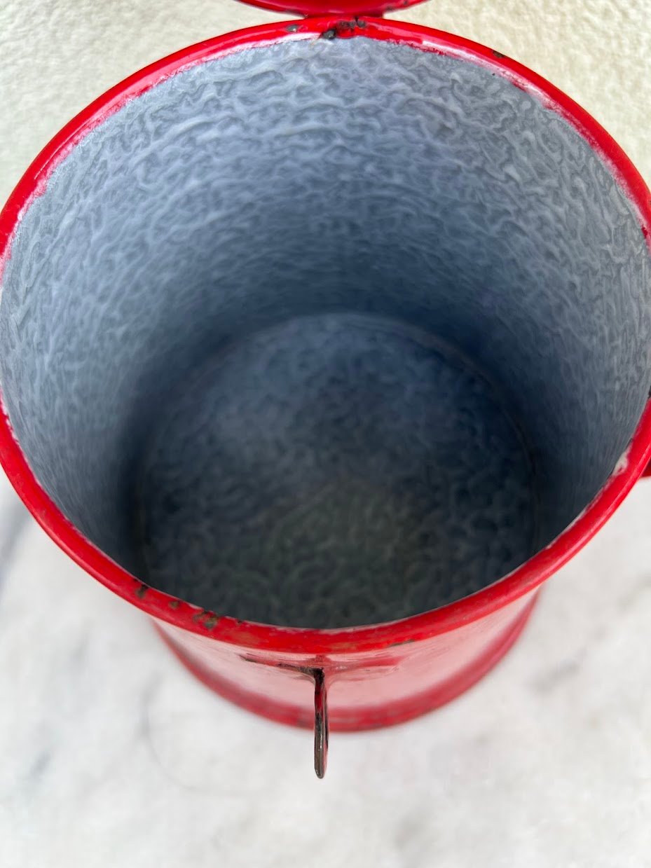Indas skardinis, emaliuotas, raudonos spalvos maistui, vintažinis, apie 1970 m. Talpa 2 l. Aukštis 21, pagrindo skersmuo 19 cm. Kaina 43