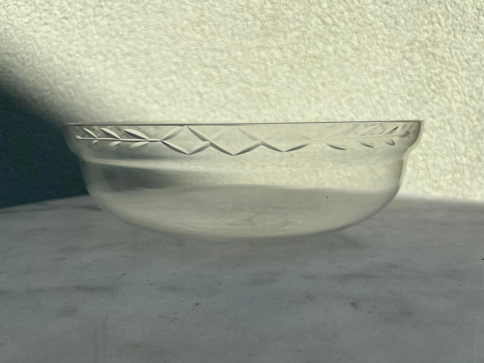Indas stiklinis, raižytas, antikvarinis. Skersmuo 25,7, aukštis 8 cm. Neskilęs, nenuskilęs. Kaina 12