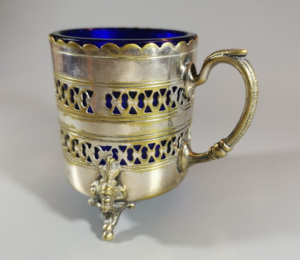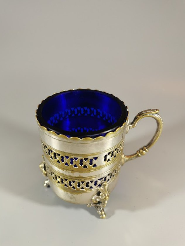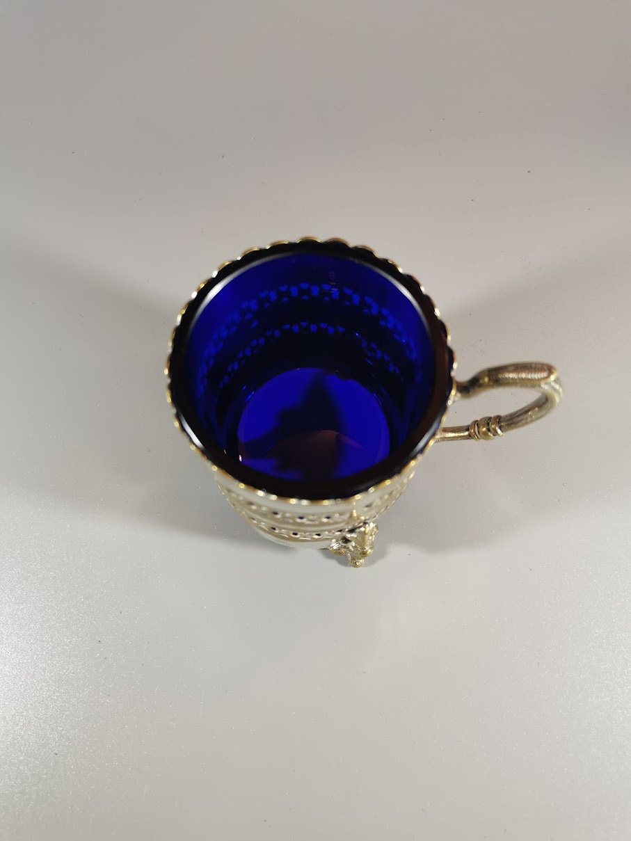 Indas su rankena, padažinė, antikvarinis, metalinis su mėlynos spalvos stiklu. Aukštis 8, indo skersmuo 6 cm. Kaina 36