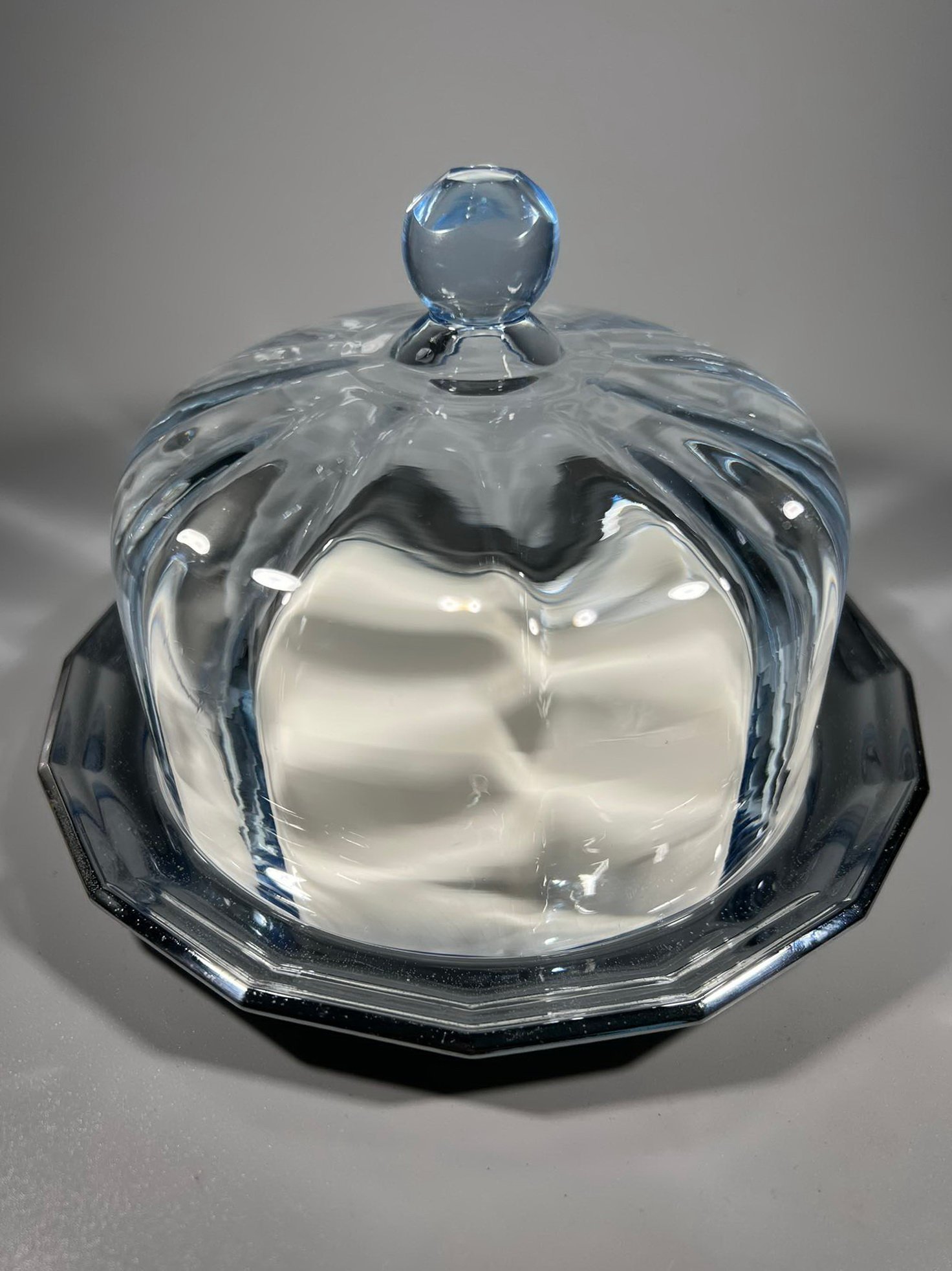 Indas su stikliniu dangčiu antikvarinis, prancūziškas, melsvo stiklo. Kaina 43