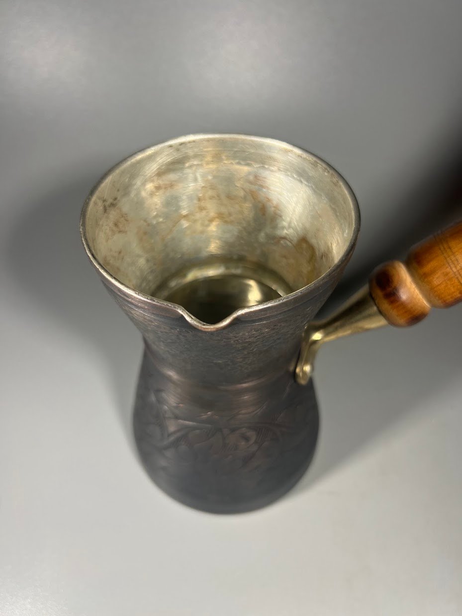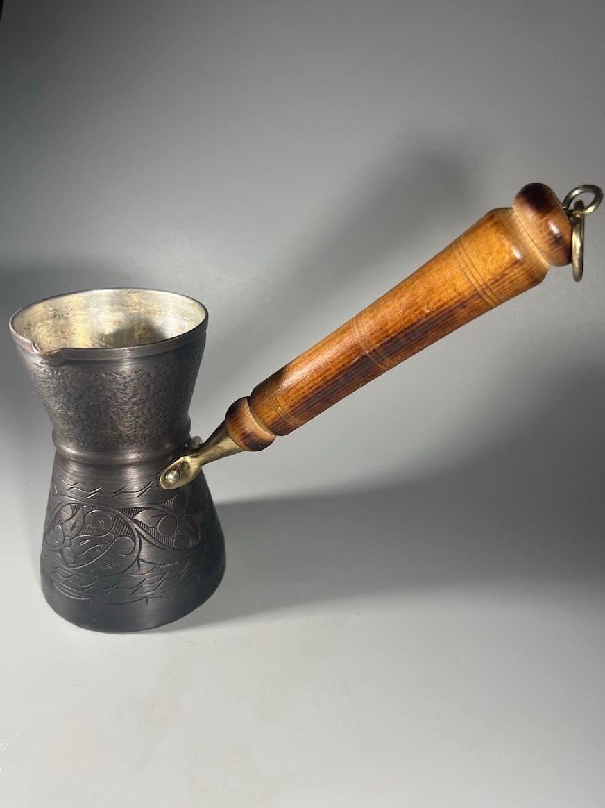 Indas varinis medine rankena kavai virti. Aukštis 14 cm. Vidus švarus. Kaina 48