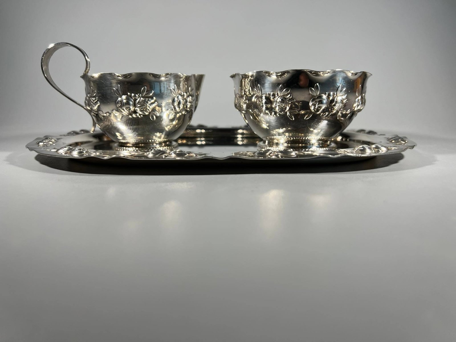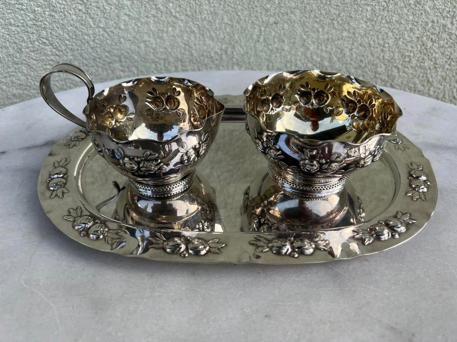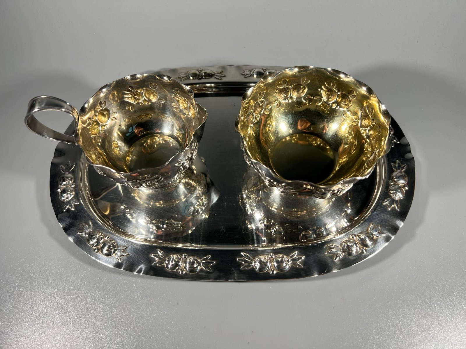 Padėklas su indais, antikvariniai, sidabruoti. Padėklo dydis: 18 x 25 cm. Indo skersmuo 9, aukštis 5 cm. Kaina 28