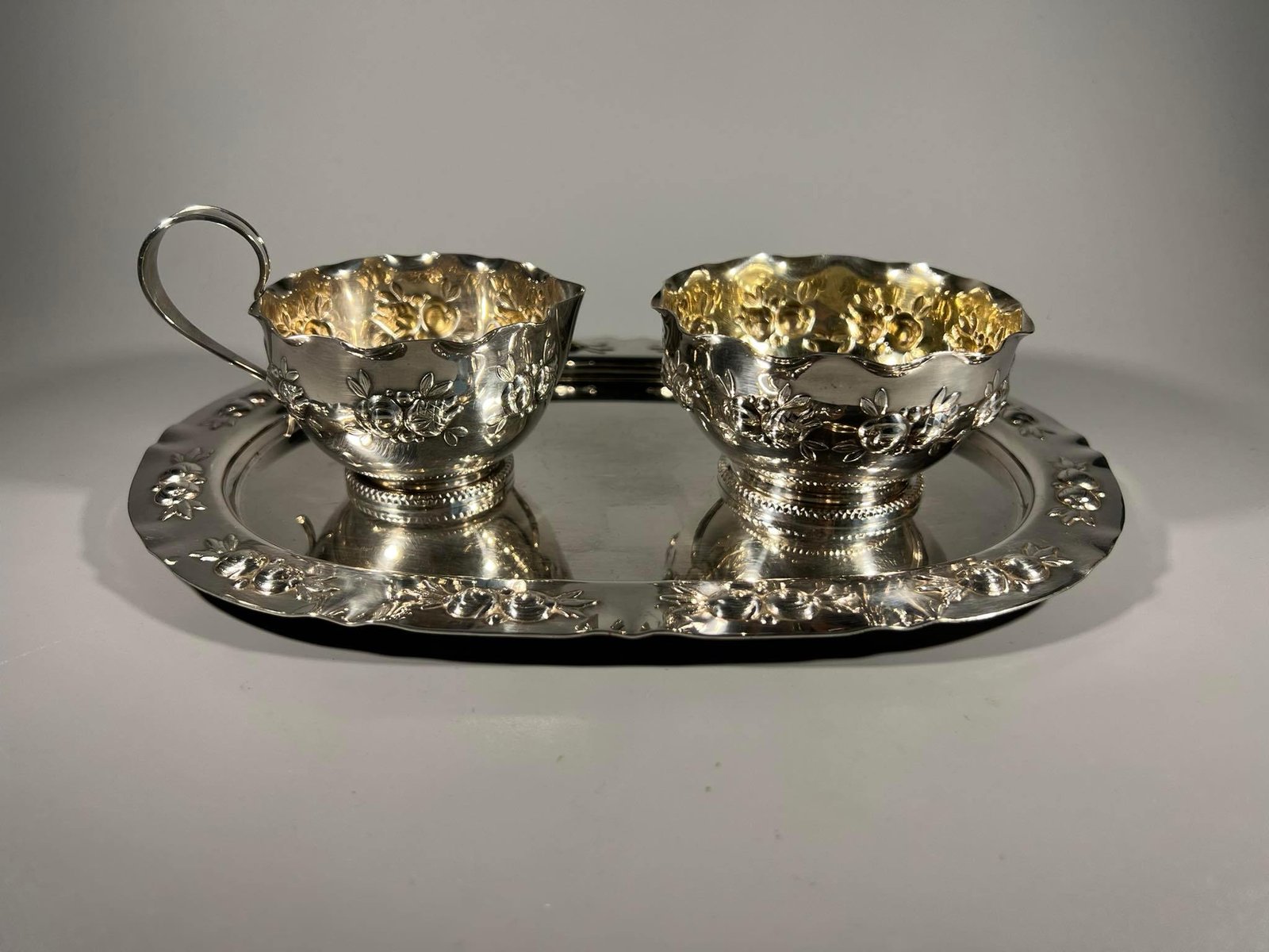 Indų sidabruotų komplektas, padėklas su indais, antikvariniai, sidabruoti. Kaina 28