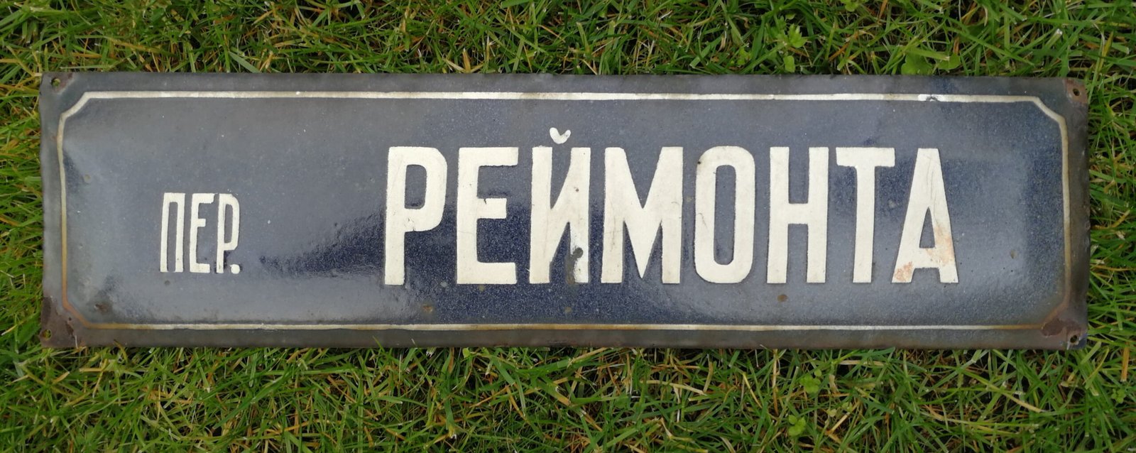 Iškaba, emaliuota ankstyvo pokario gatvės pavadinimo lentelė. пер. РЕЙМОНТА. Dydis: 54 x 15 cm. Kaina 42