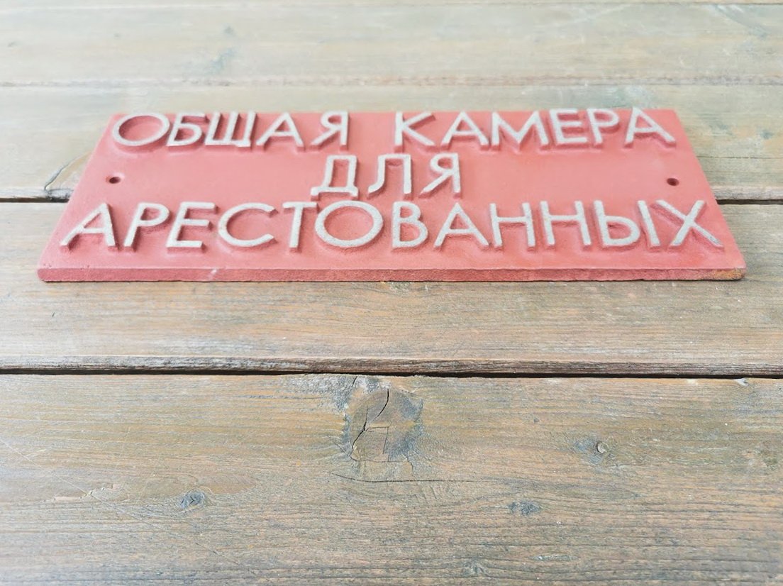 Iškaba, lentelė špižinė, ketaus Общая камера для арестованых (Bendra areštantų kamera). Svoris 2 kg. Dydis: 11 x 31 cm. Kaina 63