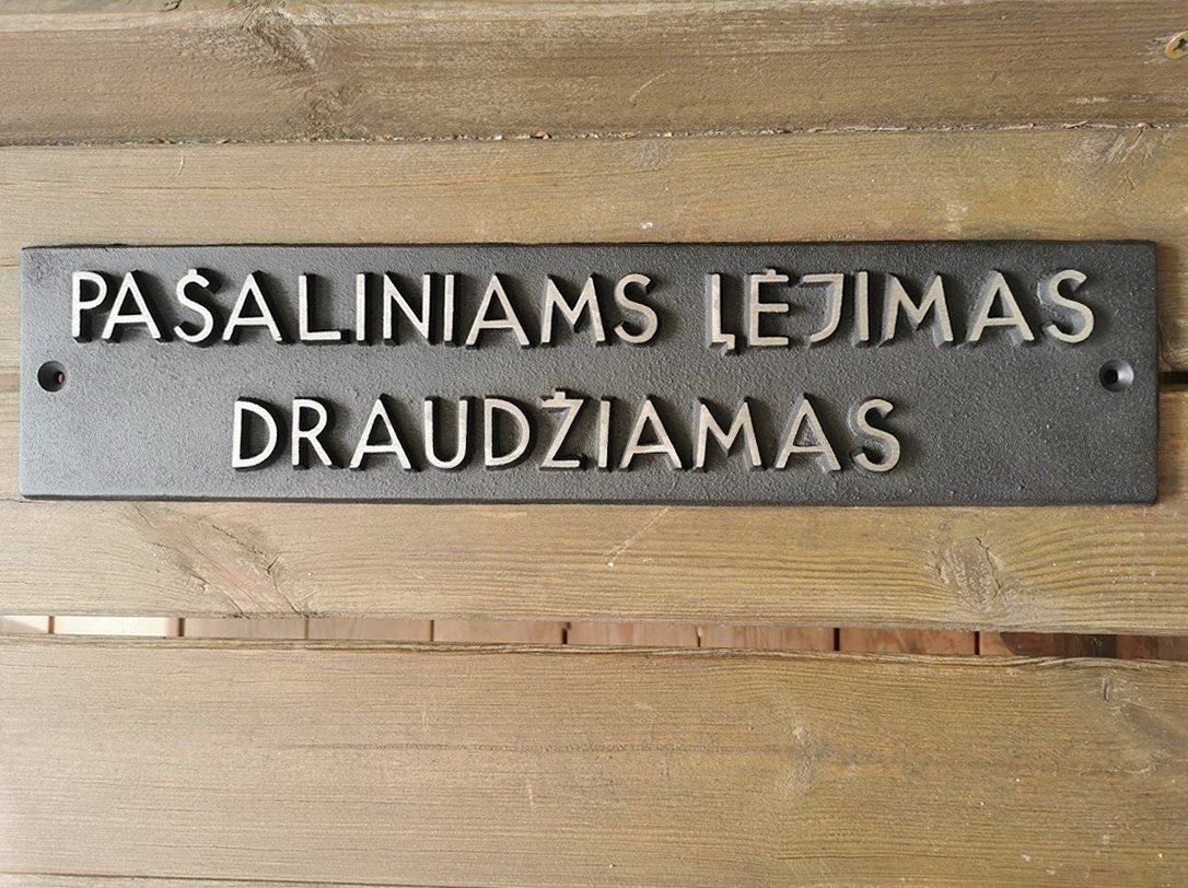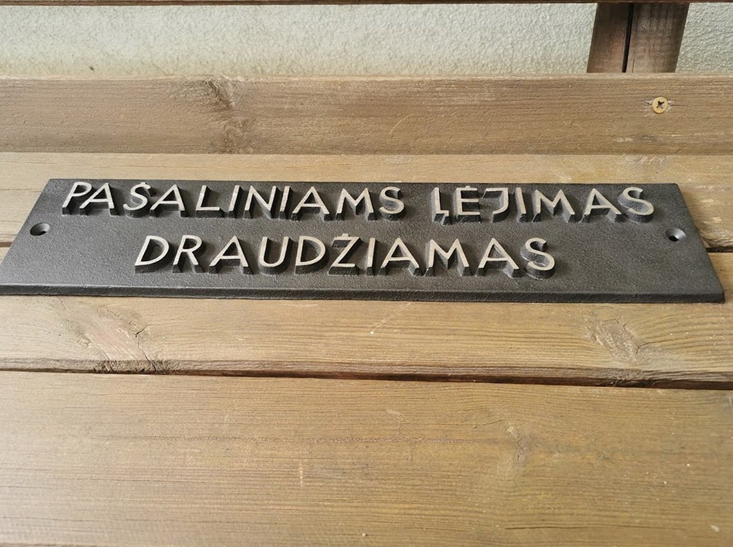 Iškaba, lentelė špižinė, ketaus PAŠALINIAMS ĮĖJIMAS DRAUDŽIAMAS. Dydis: 11 x 45 cm. Kaina 78
