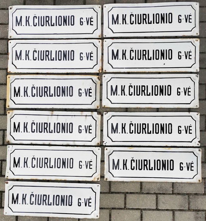 Iškabos, lentelės emaliuotos, sunkios – gatvės pavadinimai tarybinių laikų M. K. ČIURLIONIO G-VĖ. LIKO 9 vnt. Parduota apatinė. Dydis: 22 x 62 cm. Kaina po 27