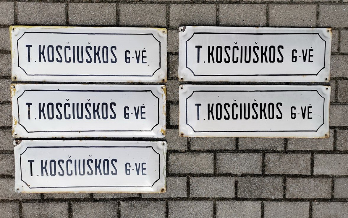 Iškabos, lentelės emaliuotos, sunkios – gatvės pavadinimai tarybinių laikų T. KOSČIUŠKOS G-VĖ. 5 vnt. Dydis: 22 x 62 cm. Kaina 27