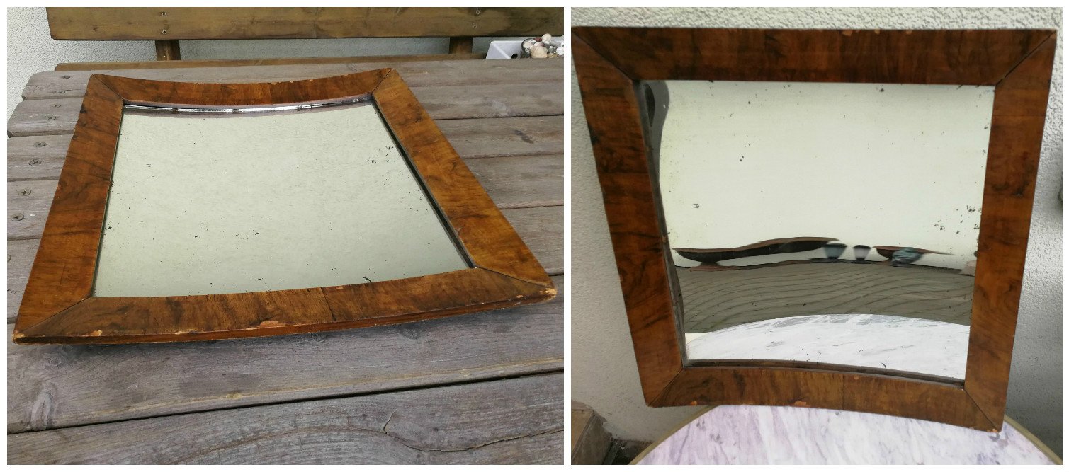 Islenktas tarpukario lietuviskas veidrodis. Dydis: 42 x 42 cm. Kaina 62