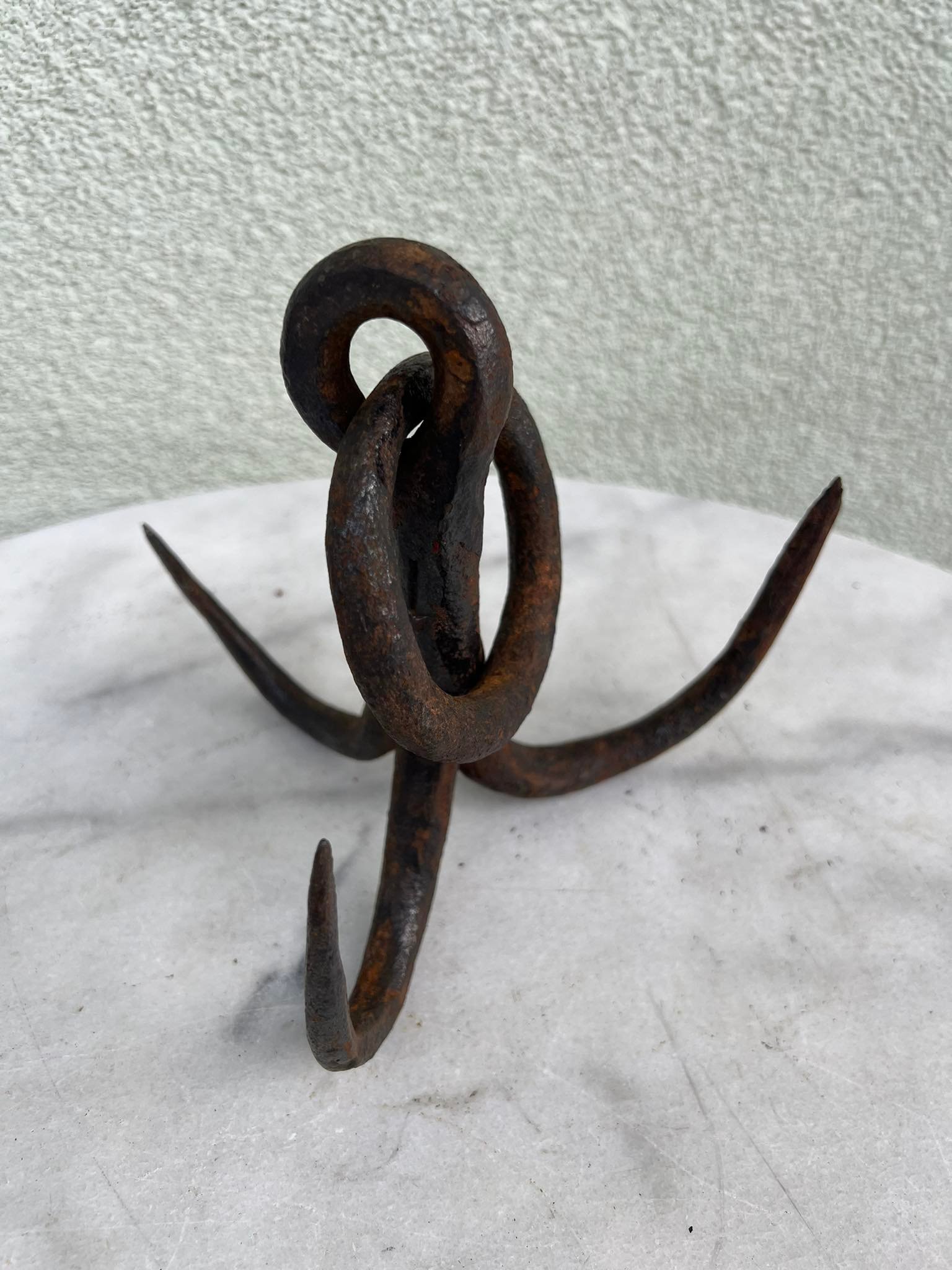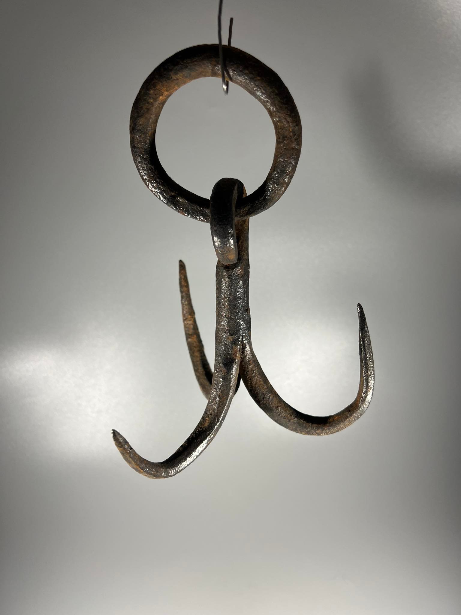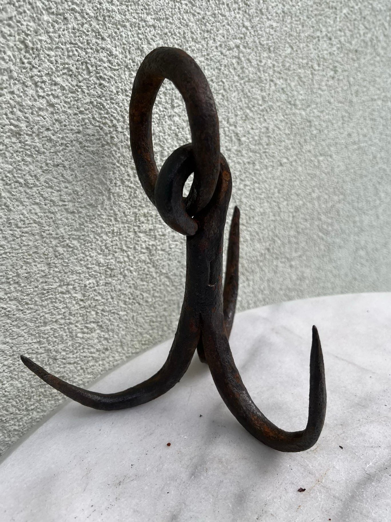 Kablys trišakis, inkaras kaltinis, antikvarinis. Aukštis 15, aukštis su žiedu 20, skersmuo 17 cm. Kaina 28