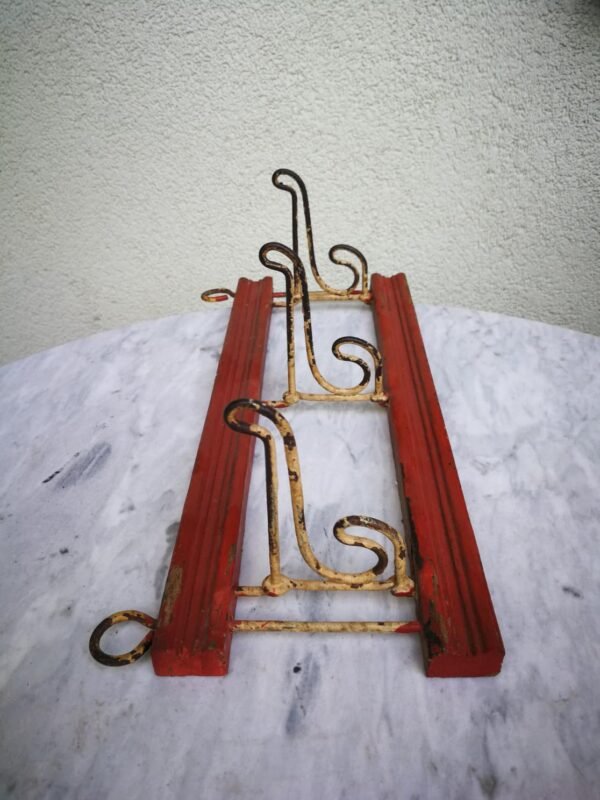Drabužių kabykla, antikvarinė, tarpukario laikų, apvalus medinis rėmas su raižyta bei siuvinėta dekoracija. Išlankstomas pasukamas medinis kabliukas skrybėlėms ar drabužiams. Įdėklas siuvinėjimas kryželiu, su rožės motyvu. Apskritimo skersmuo 20 cm. Kabliukų ilgis 20 cm. Kaina 48