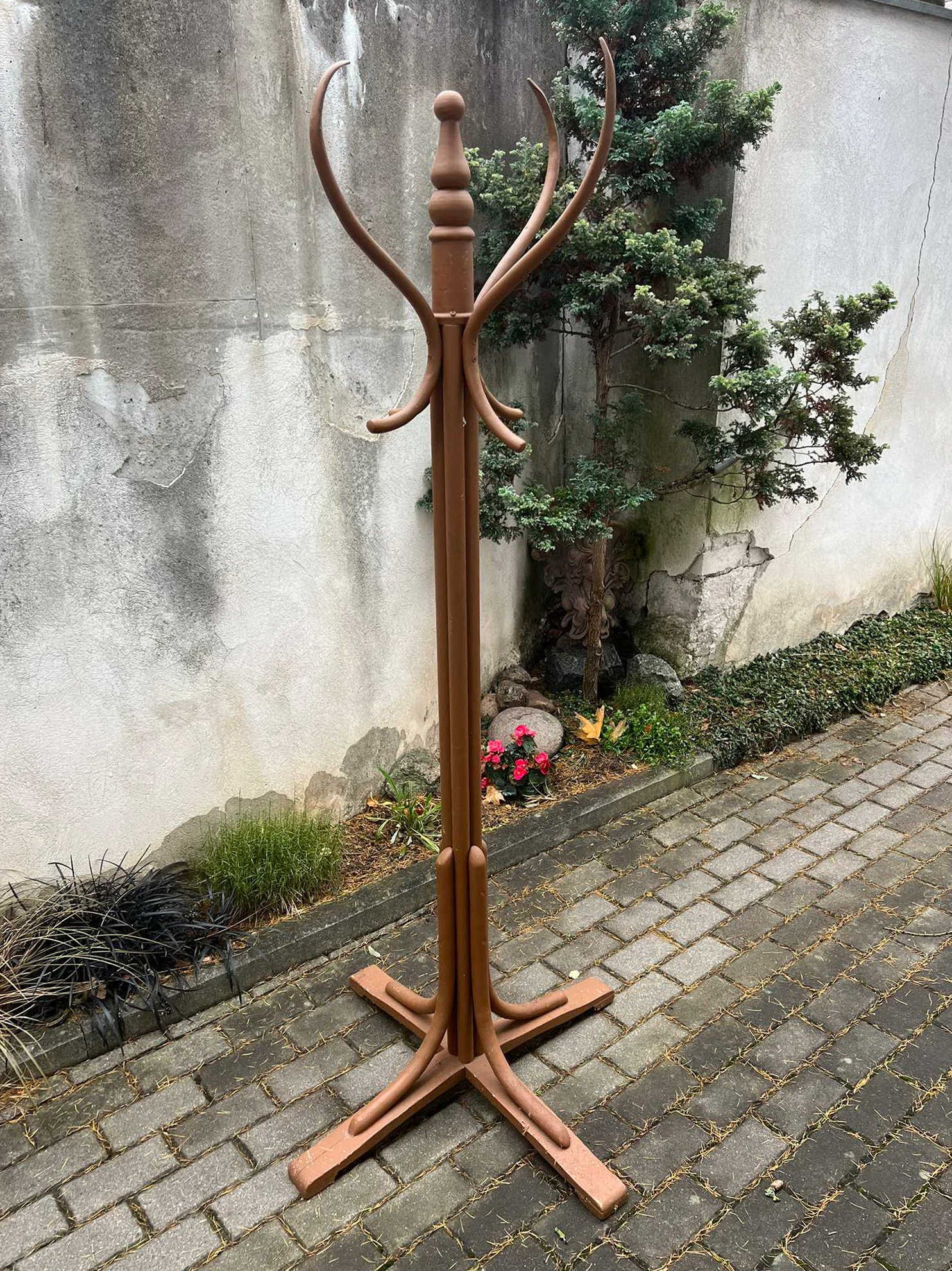 Kabykla tarpukario, lietuviška, pastatoma, medinė, Thonet stiliaus, tvirta, antikvarinė. Nulūži kabyklos dalis. Aukštis 170, pagrindo skersmuo 80 cm. Kaina 36