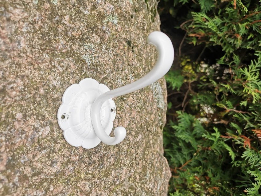 Kabykla žalvarinė nudažyta baltai. Tvirta. Atstumas nuo sienos 10 cm., pagrindo skersmuo 7,5 cm. Kaina 8