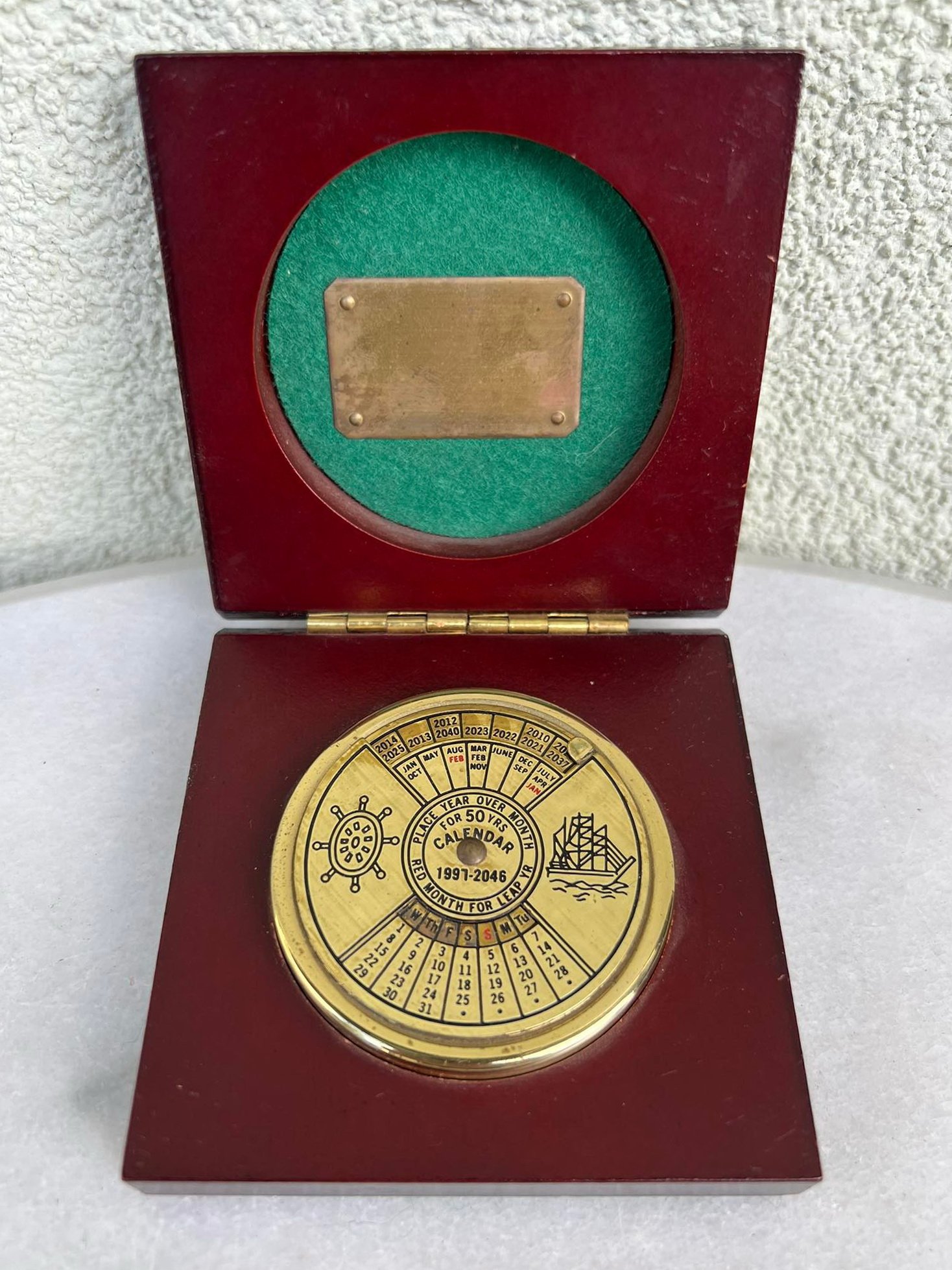 Kalendorius metalinis nuo 1997 iki 2046 m. originalioje medinėje dėžutėje. Dėžutės dydis: 2,5 x 8,5 x 8,5 cm. Kaina 16