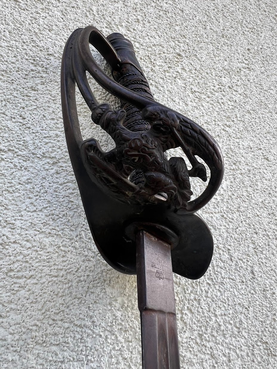Karūna virš „W“ raidės, tai yra Prūsijos valstybinis priėmimo ženklas. Raidė „W“ žymi imperatorių Vilhelmą II (Wilhelm II), kurio valdymo laikotarpiu (1888–1918 m.) šie kardai buvo gaminami. Užrašas „ERFURT“: Nurodo gamybos vietą – Karališkąją ginklų gamyklą Erfurte (Königliche Gewehrfabrik Erfurt). Tai buvo viena iš nedaugelio valstybinių gamyklų, gaminusių šiuos ginklus kariuomenės užsakymu.