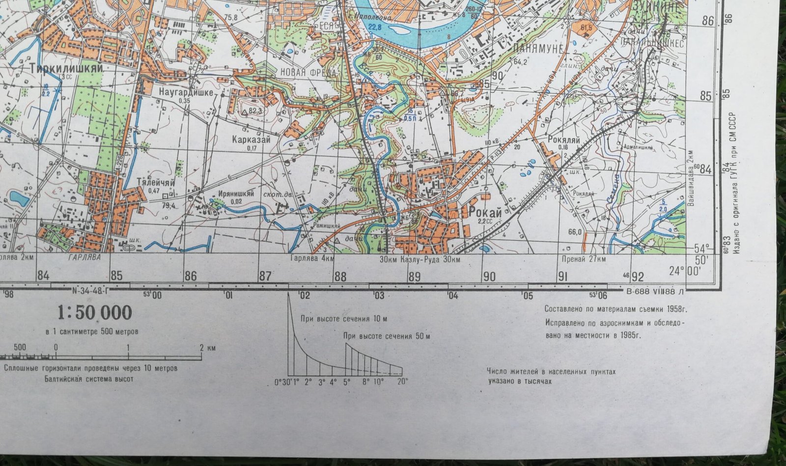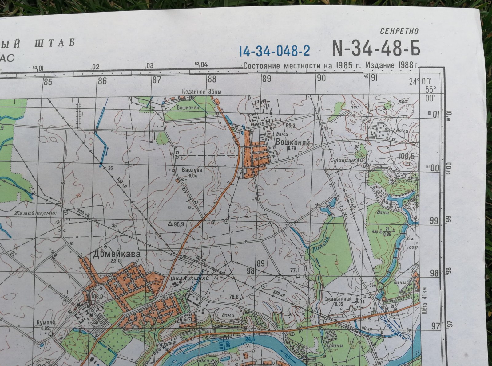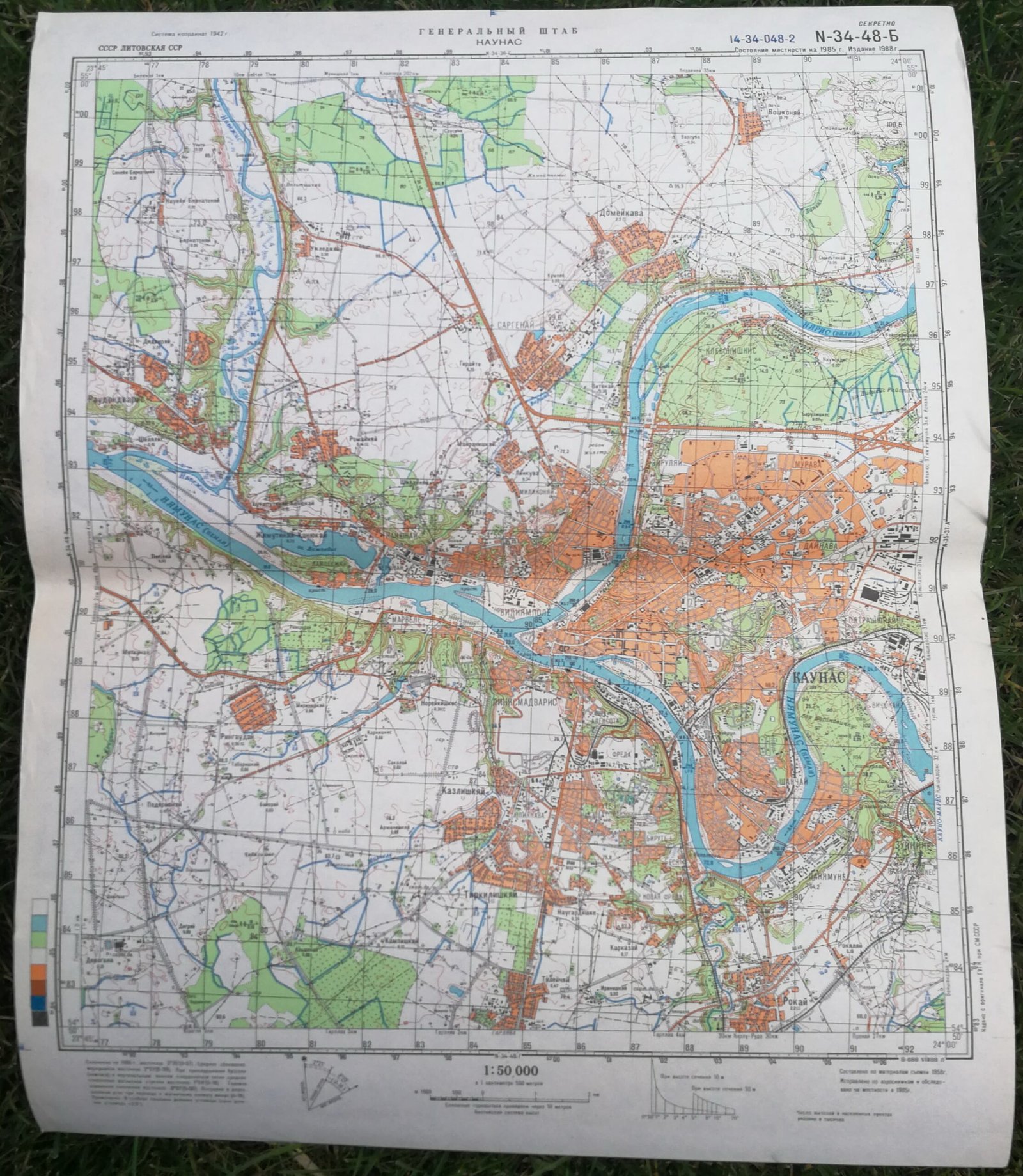 Karinis slaptas topografinis žemėlapis, KAUNAS. Dydis: 37 x 45 cm. Rusų k. 1942 m. koordinačių sistema. Vietovės būklė 1985 m. Leidimas 1988 m. Kaina 36