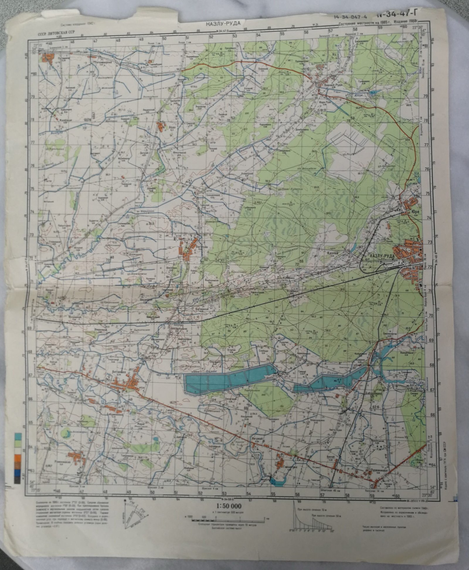 Karinis slaptas topografinis žemėlapis, KAZLŲ RŪDA. Dydis: 38 x 45 cm. Rusų k. 1942 m. koordinačių sistema. Vietovės būklė 1985 m. Leidimas 1988 m. Kaina 16