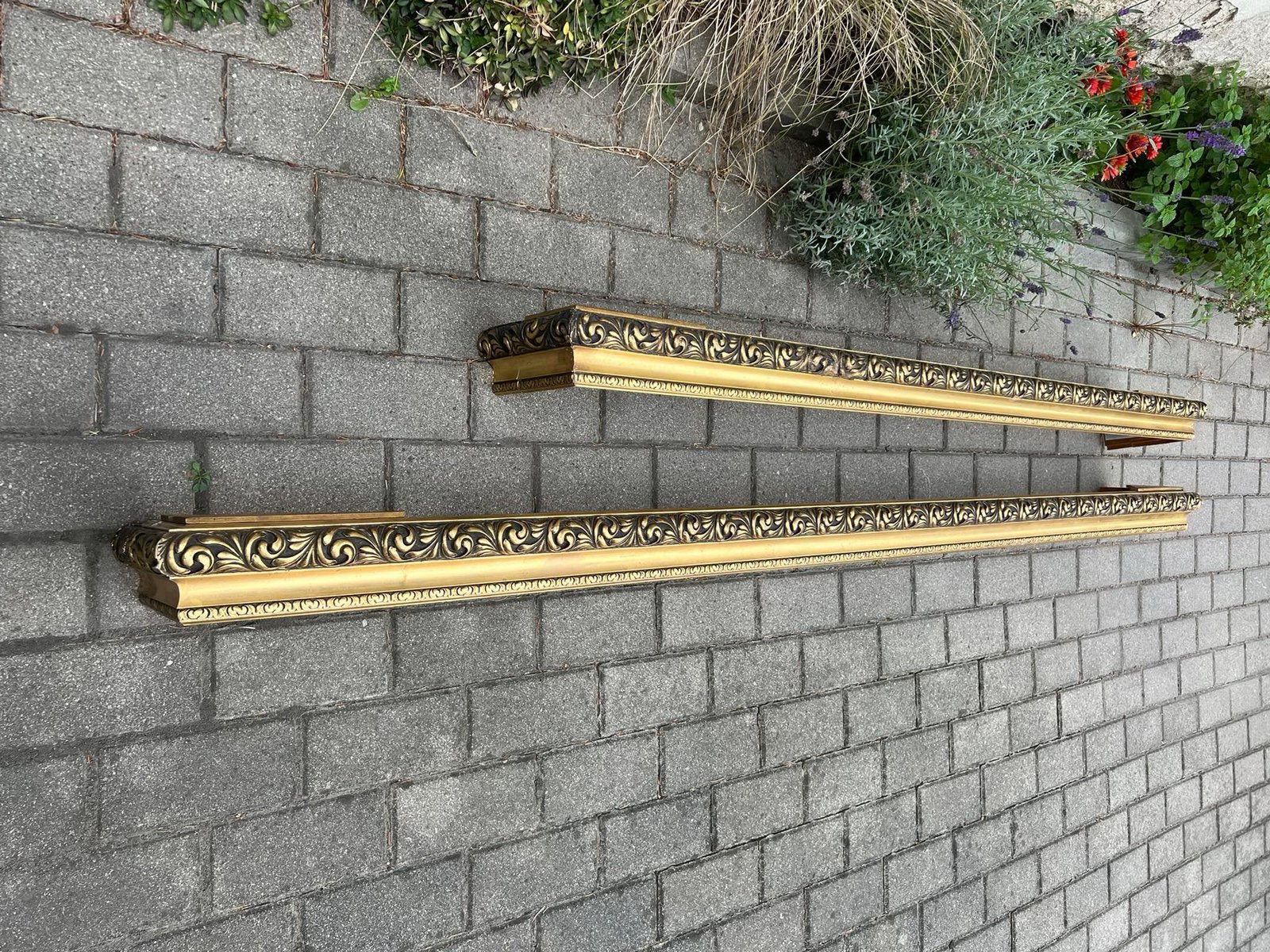 Karnizai mediniai puošti gipsu, auksavimu. 2 vnt. Ilgis 162 ir 203 cm. Plotis po 10, atstumai nuo sienos po 20 cm. Kainos: 78 ir 98