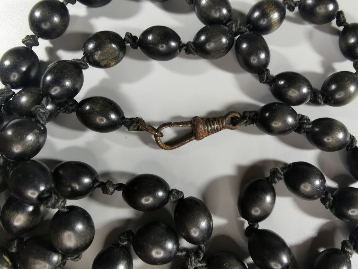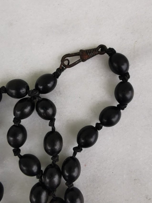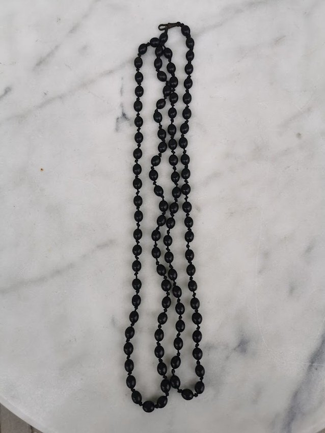 Karoliai ilgi, mediniai, antikvariniai, tarpukario laikų, rasti Kaune. Juodos, matinės spalvos. Narelio ilgis 1 cm. Ilgis 164 cm. Kaina 63