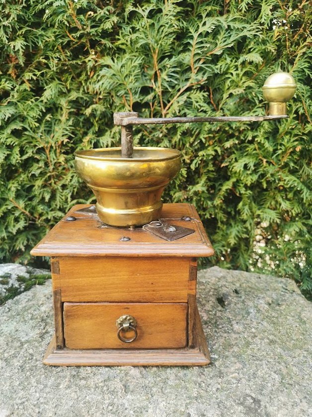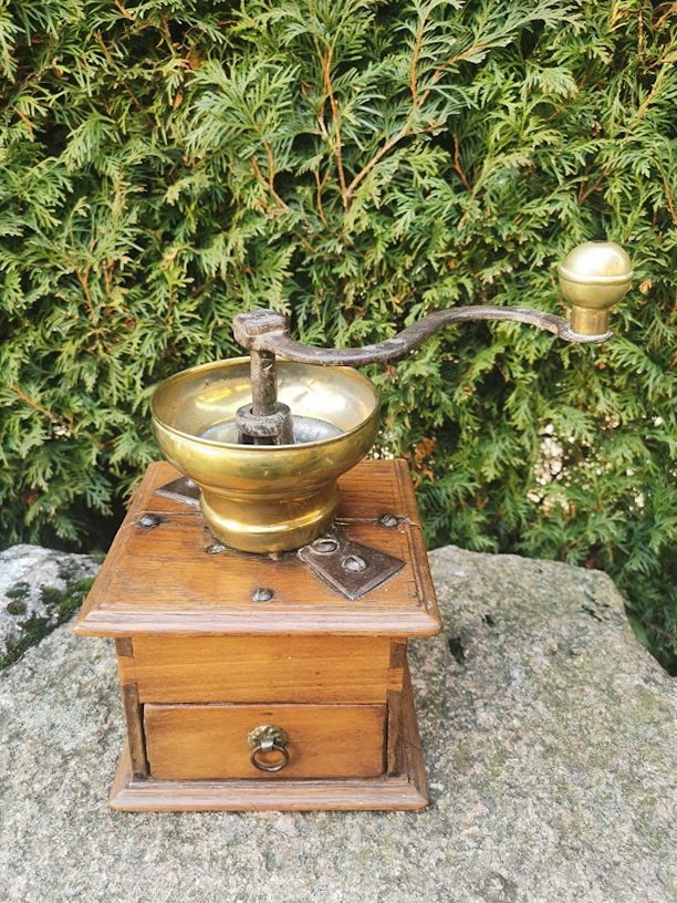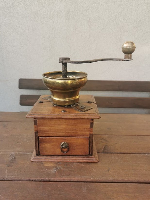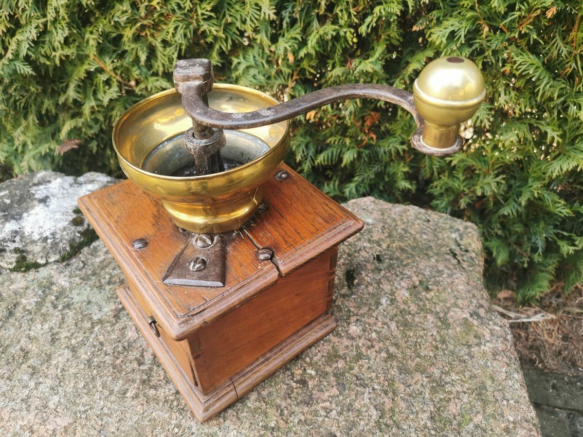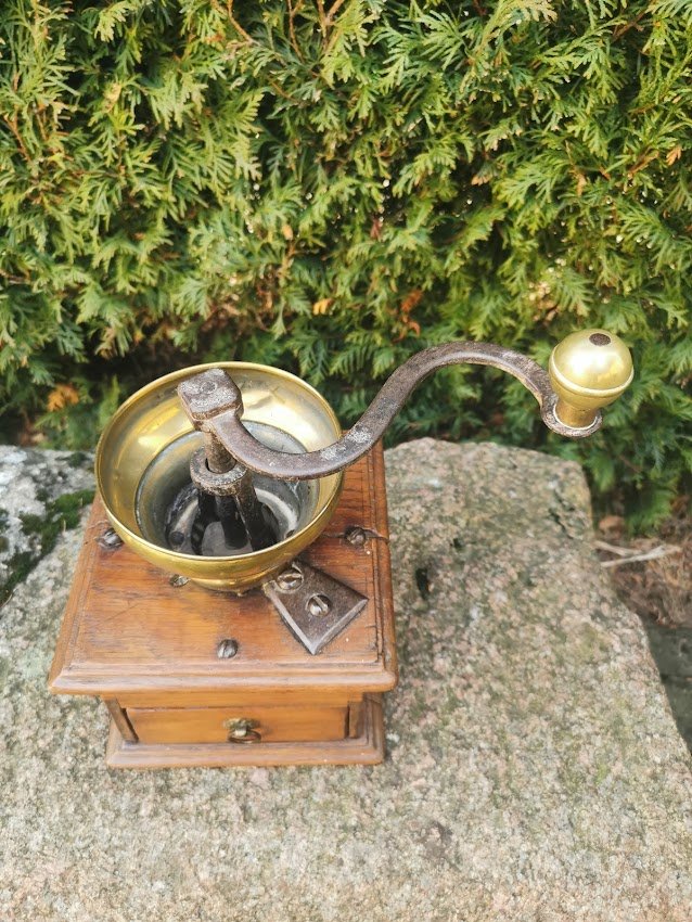 Kavamalė antikvarinė, didelė. Veikianti. Aukštis su rankena 30, korpuso dydis: 14 x 17 x 17 cm. Kaina 63