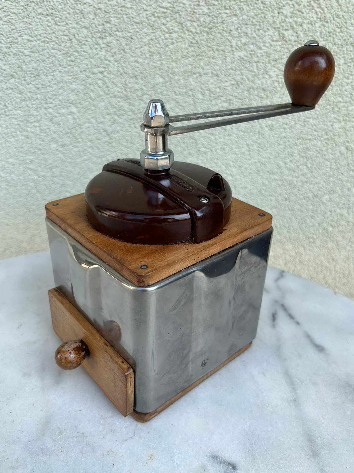 Kavamalė antikvarinė, prancūziška, nikeliuota skarda, bakelitas. Frère Peugeot, France. Kaina 76