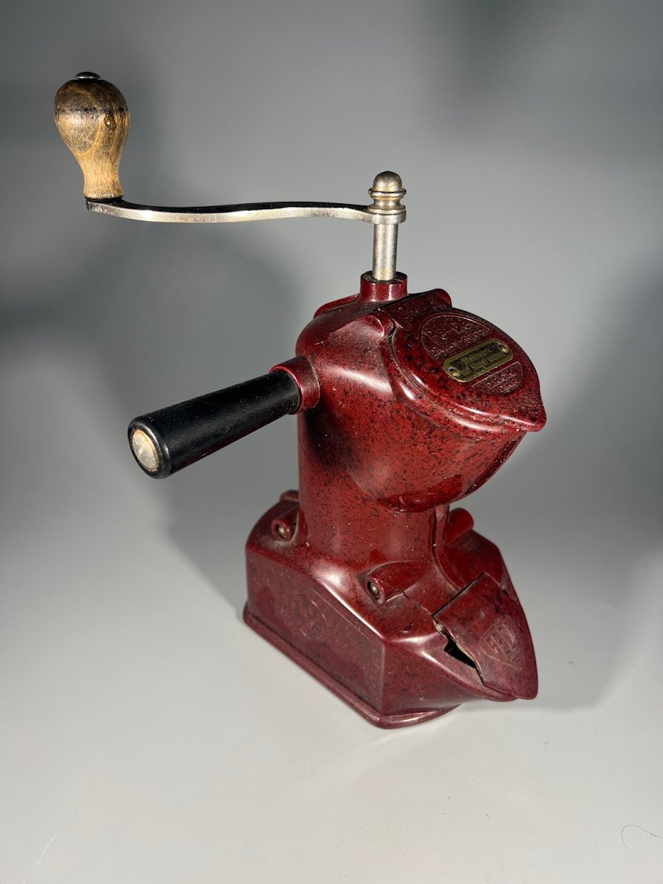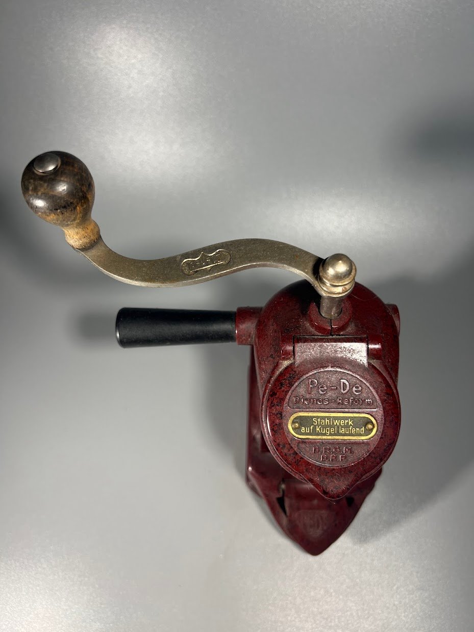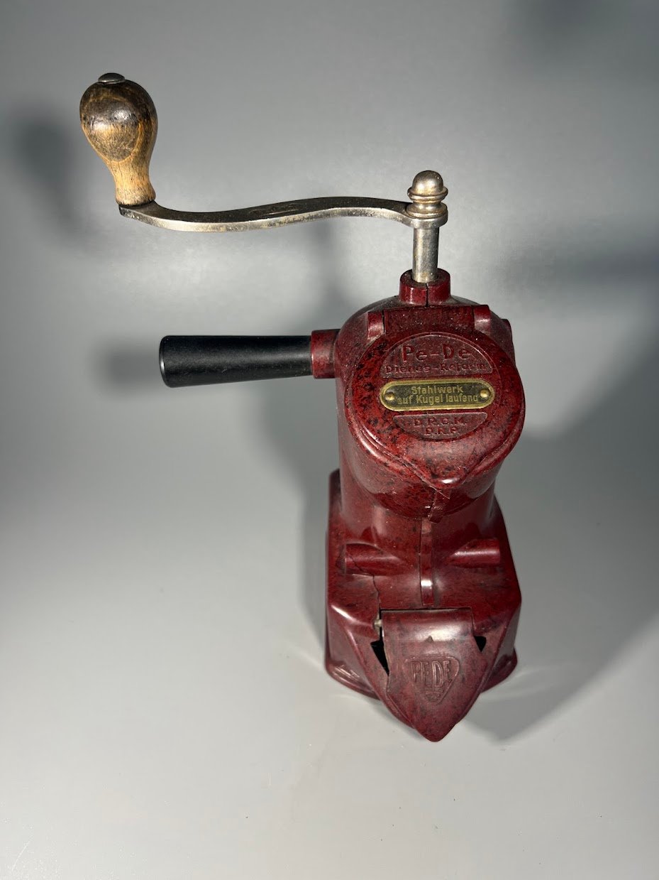 Kavamalė, kavos malūnėlis antikvarinis, tarpukario laikų, bakelitinis PeDe Dienes (Peter Dienes) 411, Vokietija. 1930–1935 m. Aukštis 22 cm., su rankenėle 24 cm. Būklė matoma nuotraukose. Kaina 128
