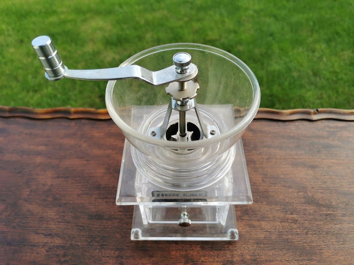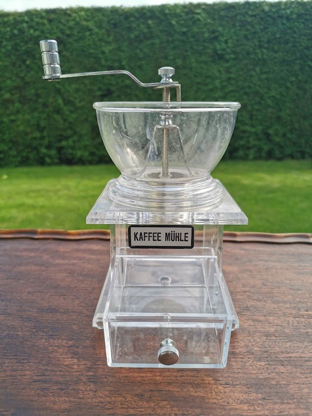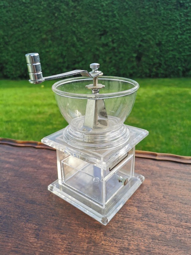Kavamalė, kavos malūnėlis. Organinio stiklo. Vokietija. Aukštis 19, plotis 13 cm. Kaina 68