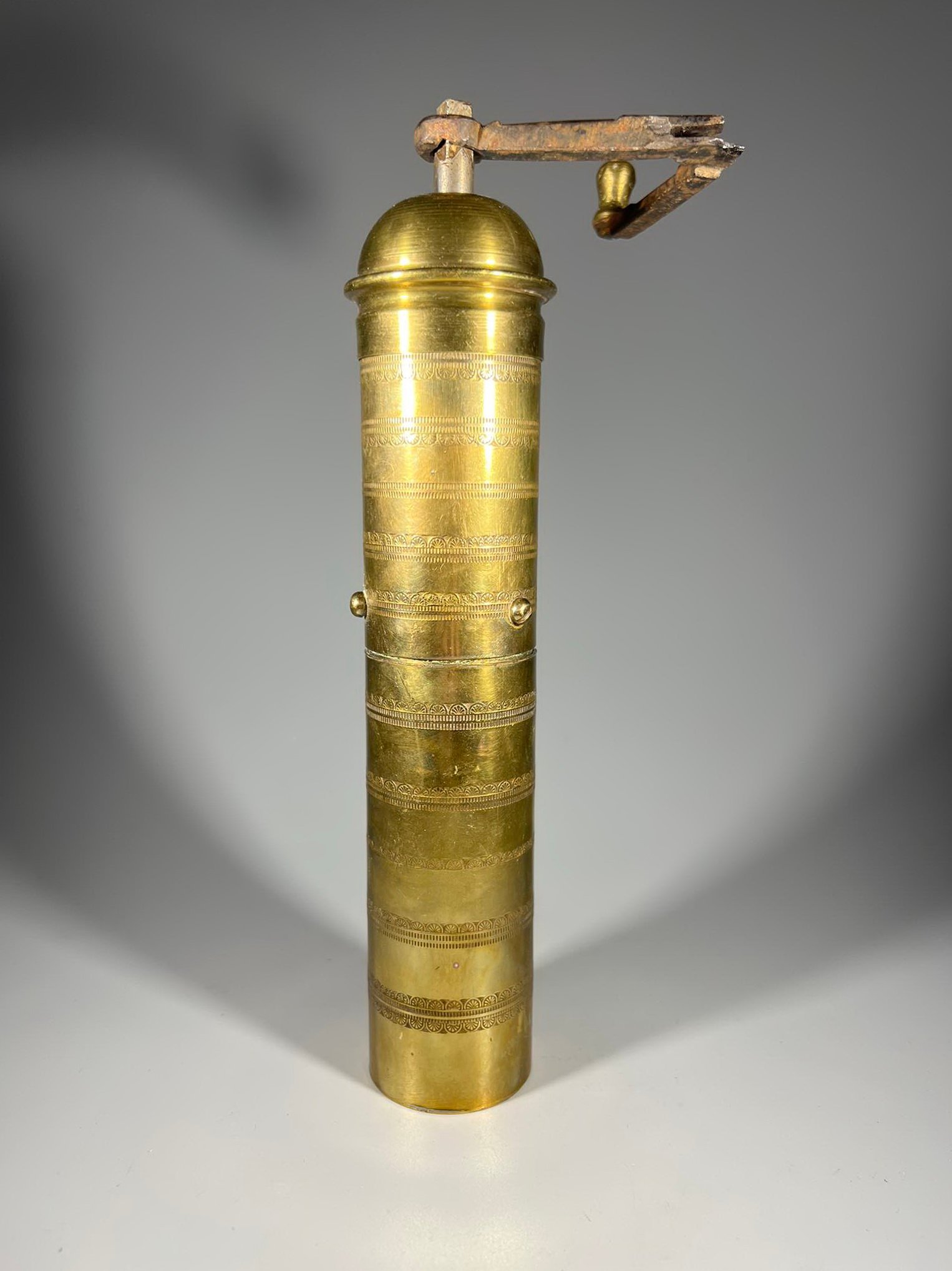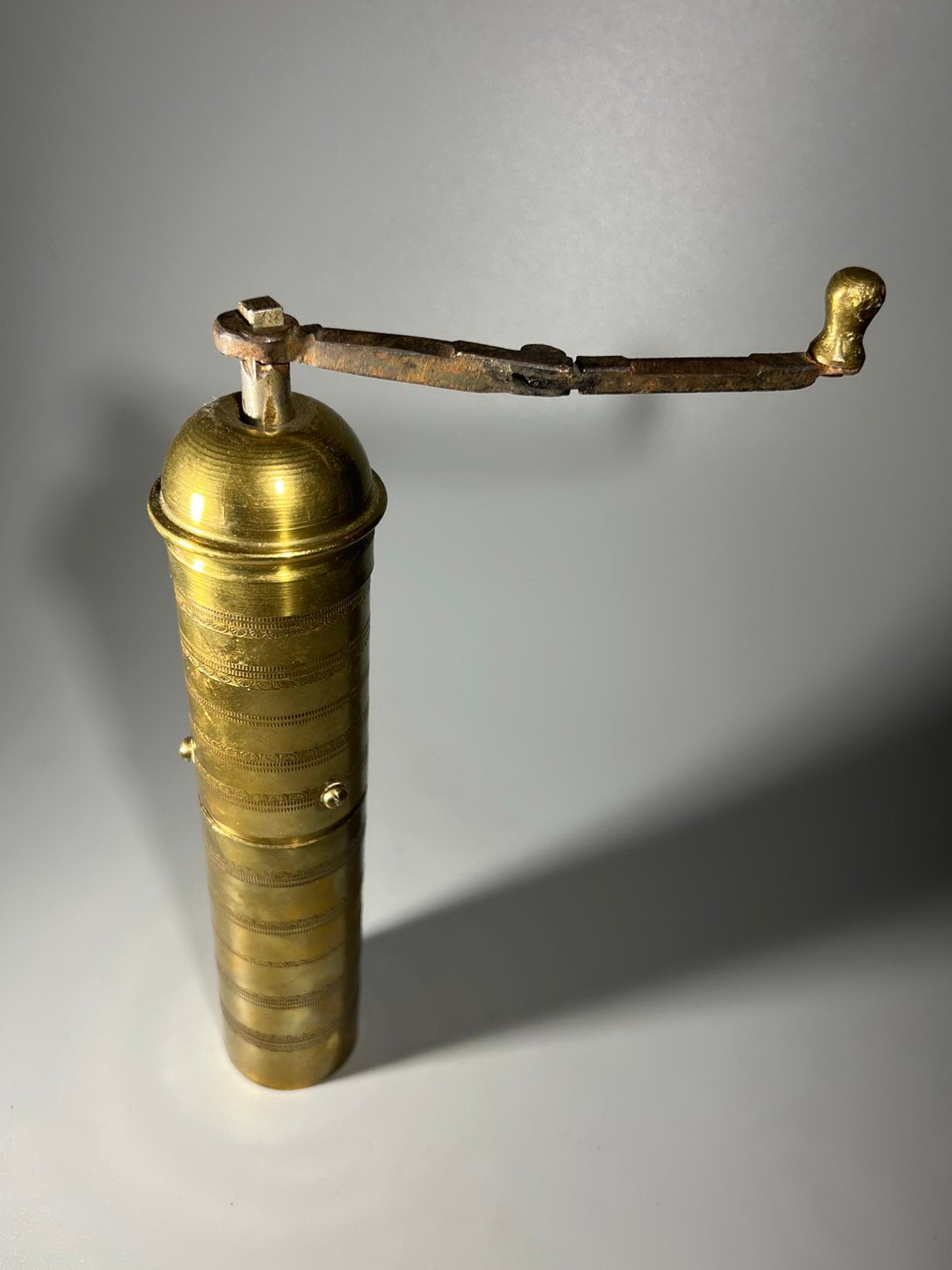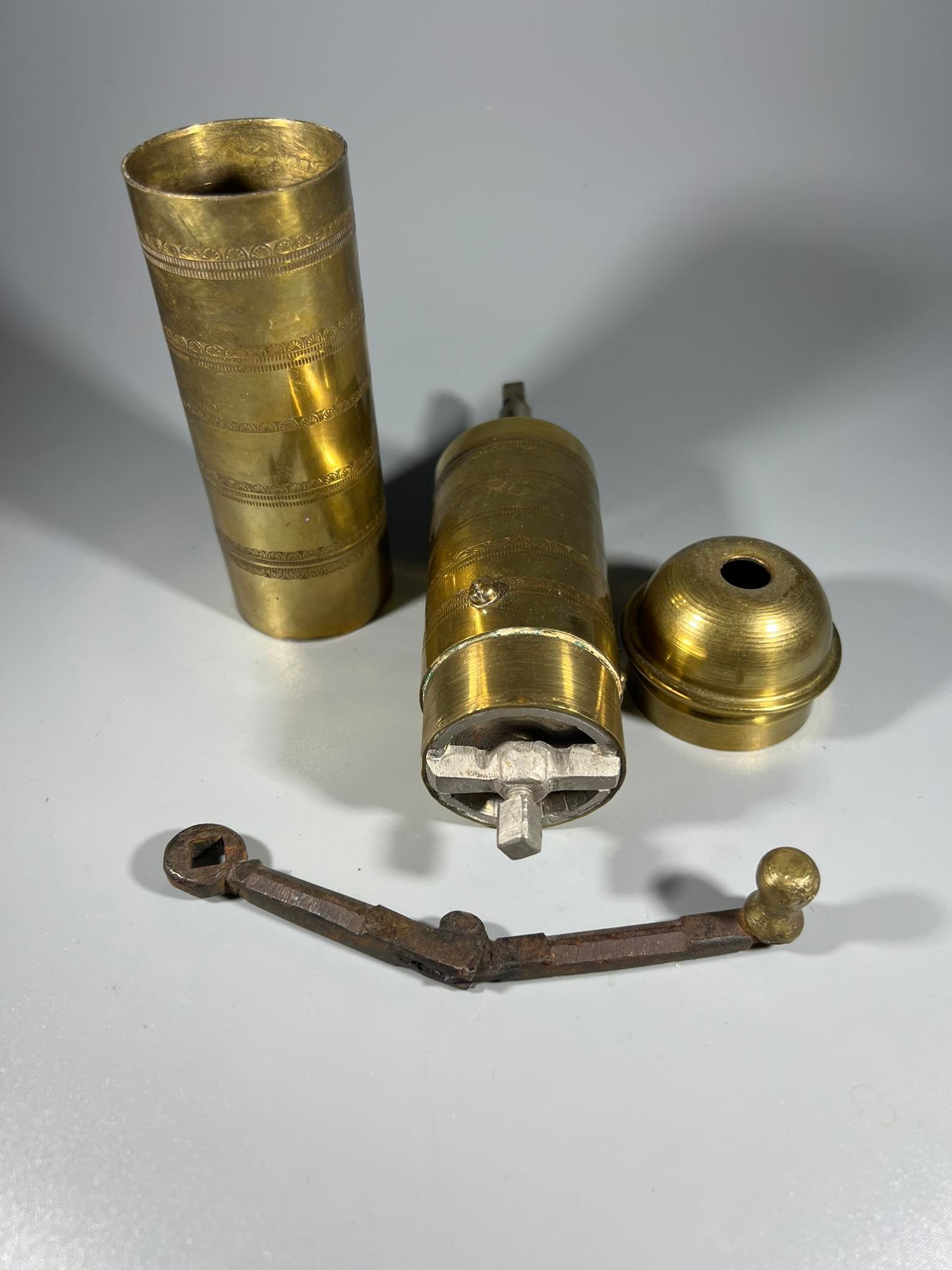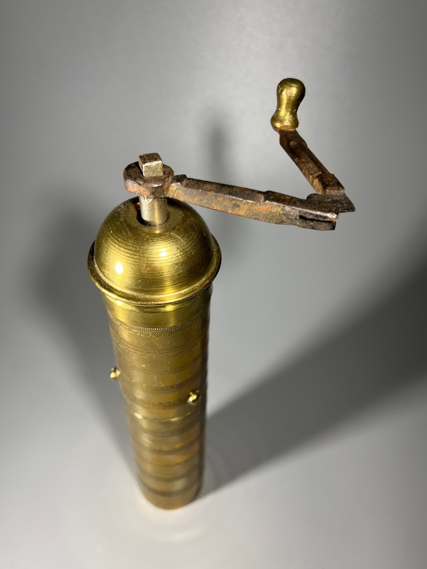 Kavamalė, pipirmalė rytietiška, puošta ornamentais, žalvarinis malūnėlis. Veikianti. Aukštis 25 cm. Kaina 43