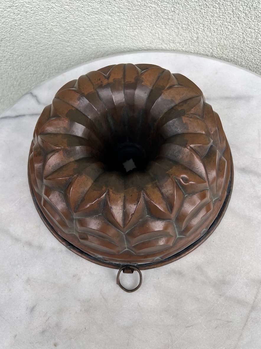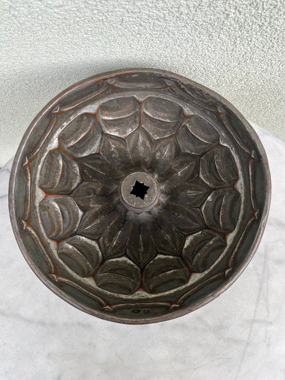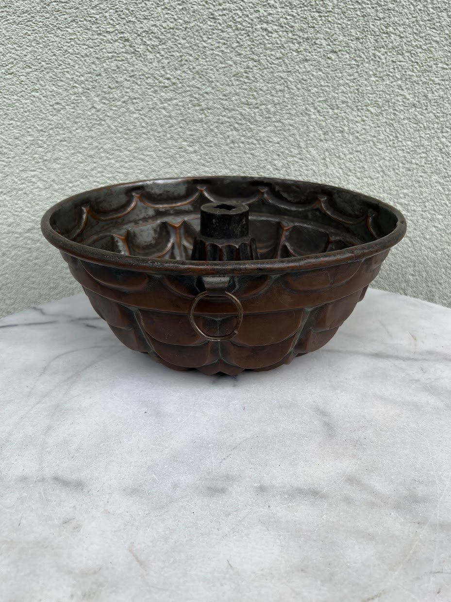 Kepimo forma skardinė, varinė, antikvarinė, tarpukario laikų. Aukštis 12, viršutinis skersmuo 27,5 cm. Vidus dengtas cinku, tinkamu maisto gaminimui. Kaina 68