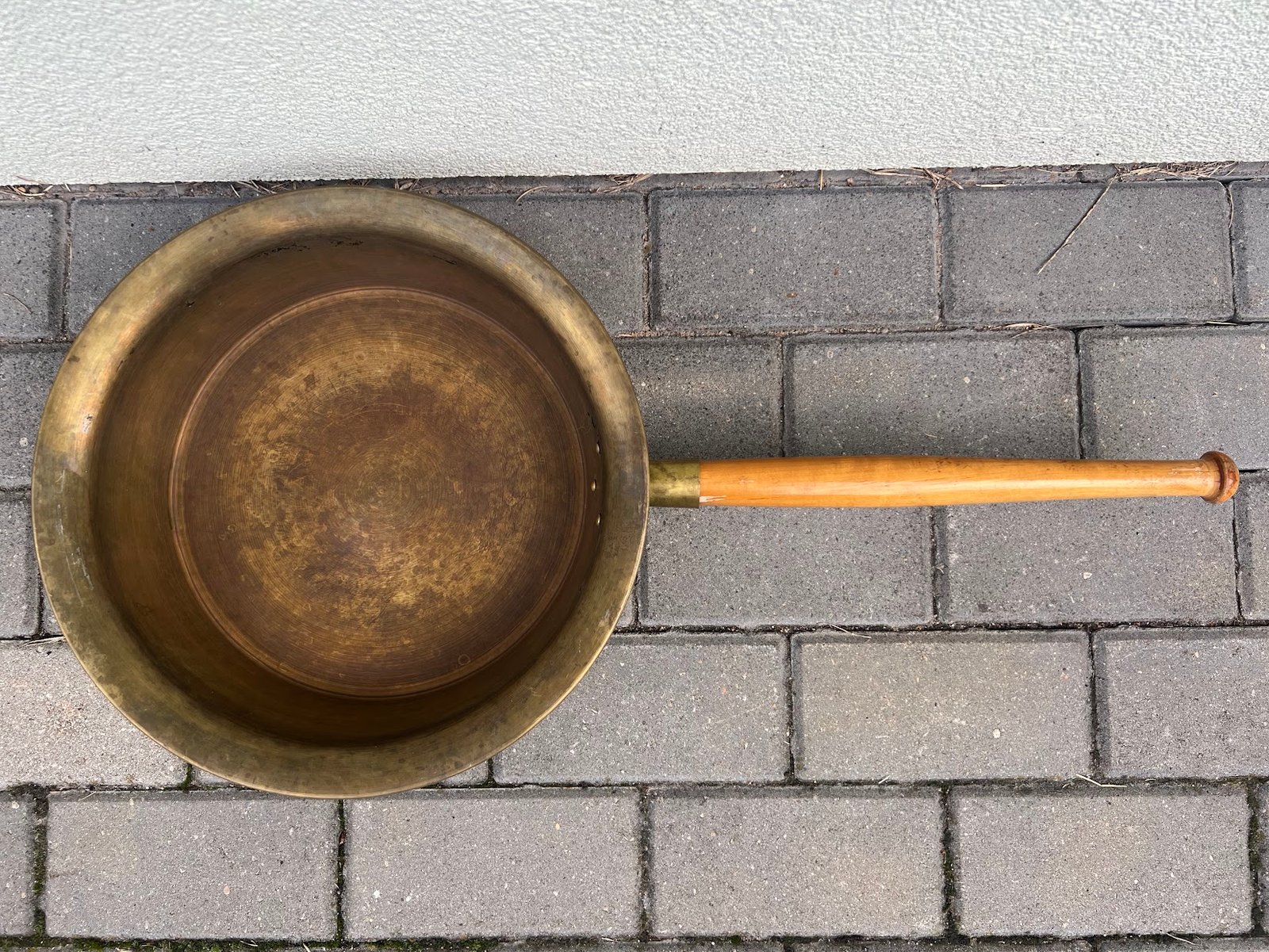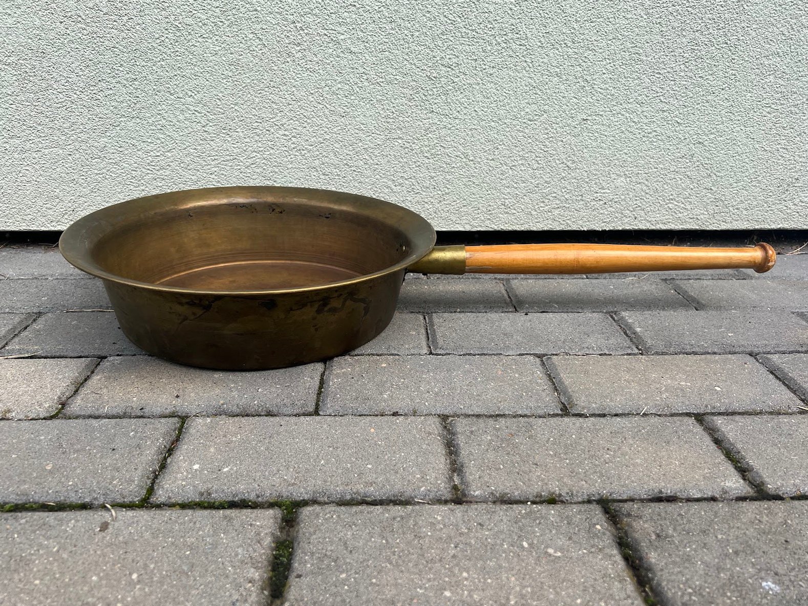Keptuvė žalvarinė su originalia rankena. Ilgis su rankena 61, viršutinis skersmuo 36 cm. Kaina 68