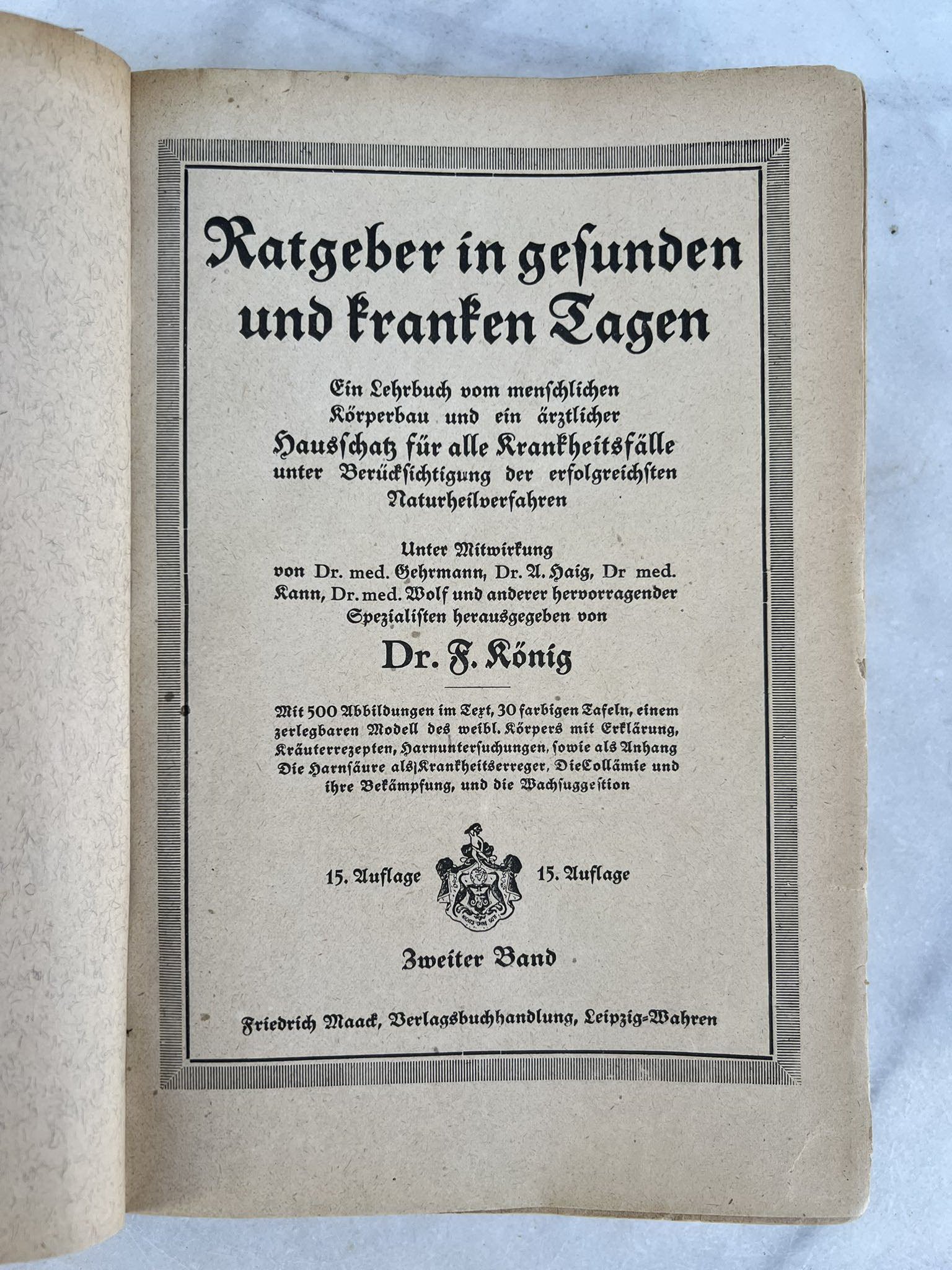 Knyga medicininė, antikvarinė Ratgeber in gesunden und kranken Tagen. König, F. Sveikų ir sergančių dienų vadovas. Apie 1920 m. Kaina 28