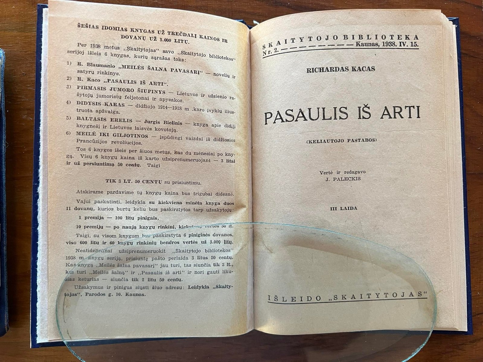 Knyga Pasaulis iš arti. R. Kacas. 1938 m. III laida. Kieti viršeliai. 111 psl. Kaina 26