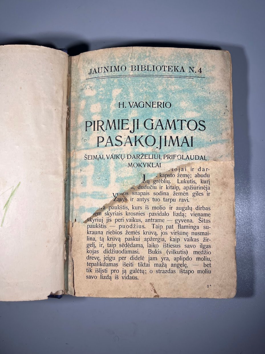 Knyga Pirmieji gamtos pasakojimai, H. Vagnerio (vertė B. Masiulis), išleista 1922 m. Leidykla Švyturys Kaune. Kaina 33