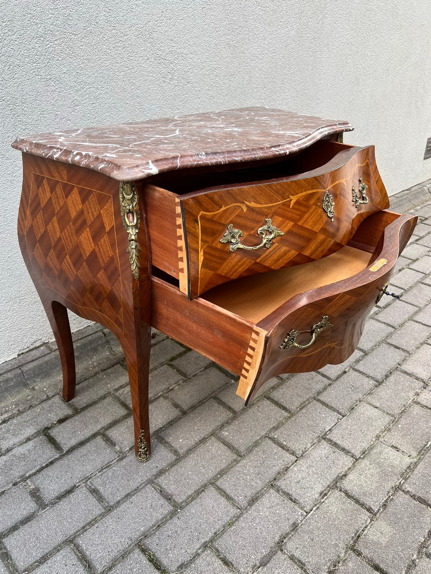 Komoda rausvo marmuro stalviršiu, puošta bronza, rakinama, antikvarinė. Aukštis 72, ilgis 79, plotis 41 cm. Kaina 287