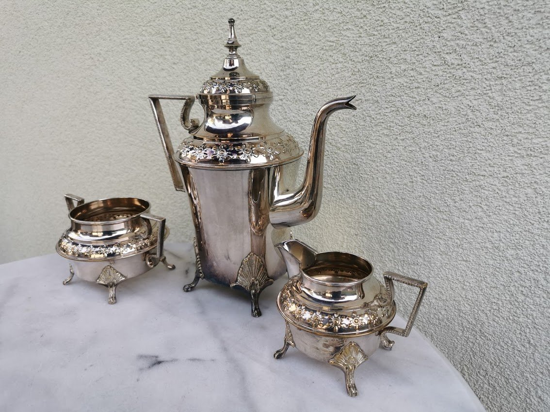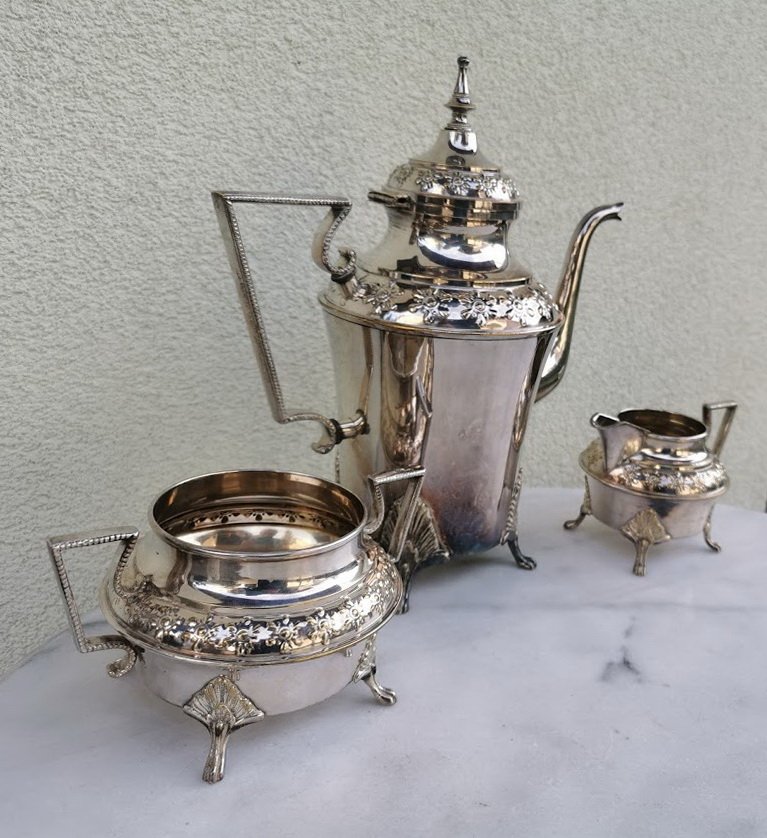 Komplektas antikvarinis, sidabruotas. Arbatinio/kavinuko aukštis 27 cm. Arbatinukas/ kavinukas, indas cukrui ir grietinėlei. Kaina 82