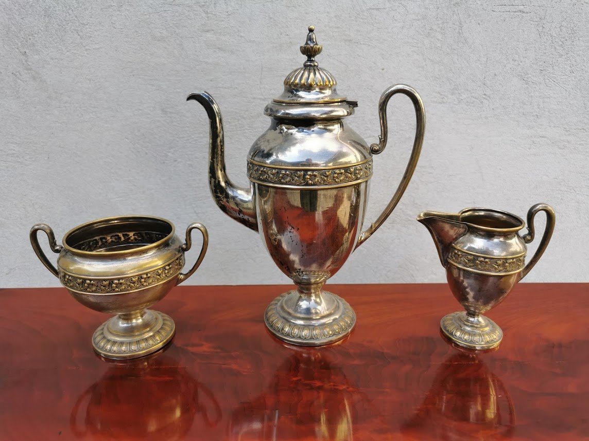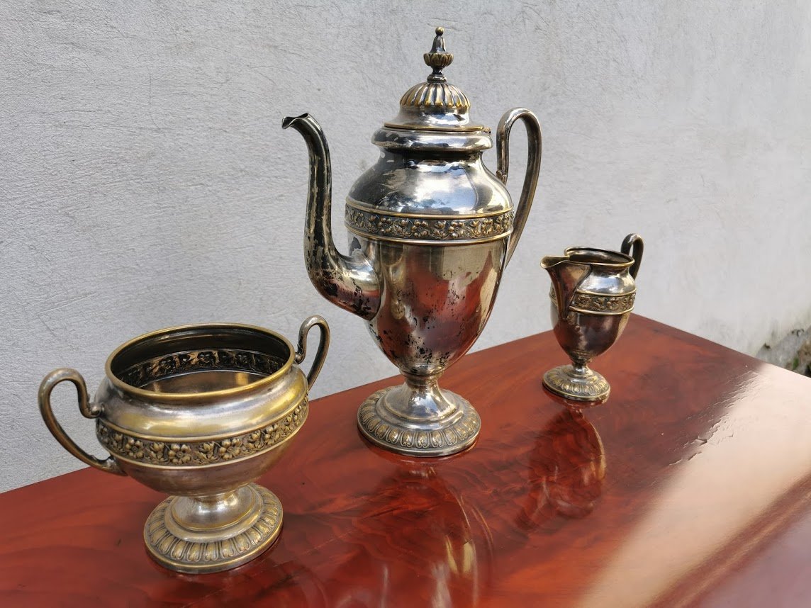Komplektas antikvarinis, sidabruotas. Kavinukas – arbatinukas, cukrinė, pienui/grietinėlei. Kaina 58