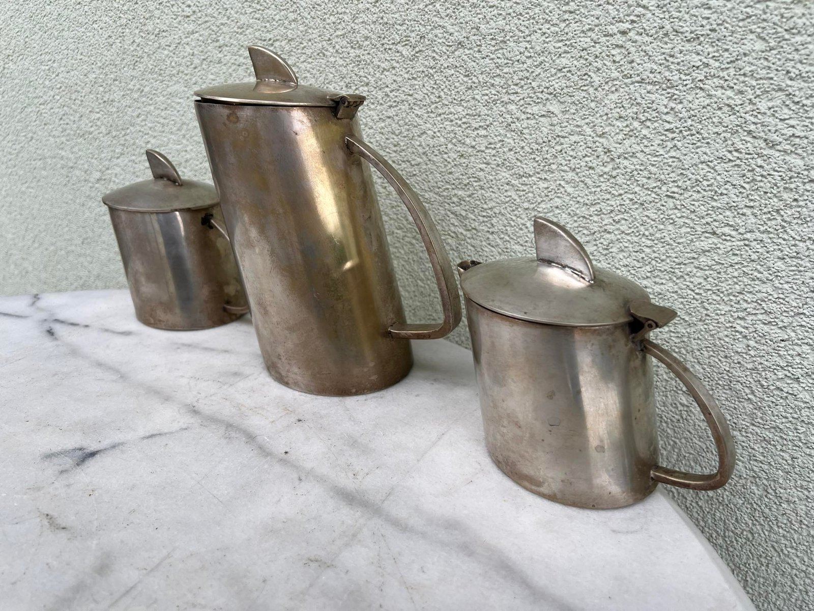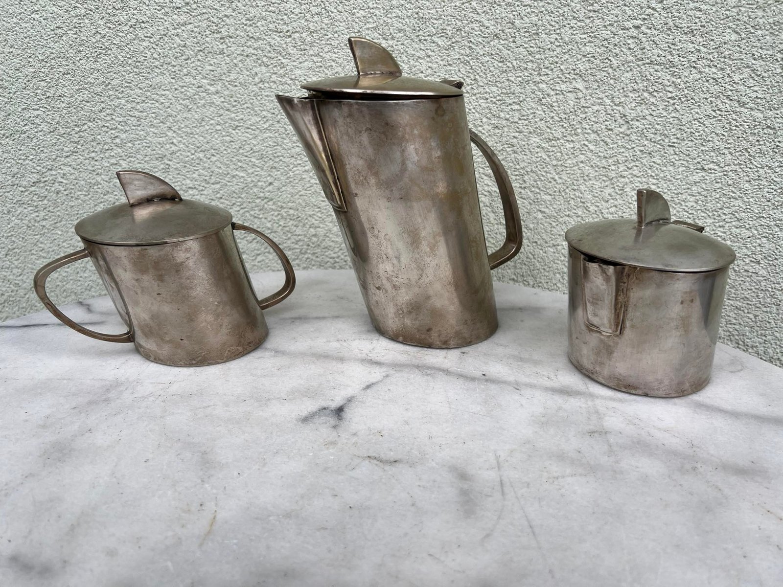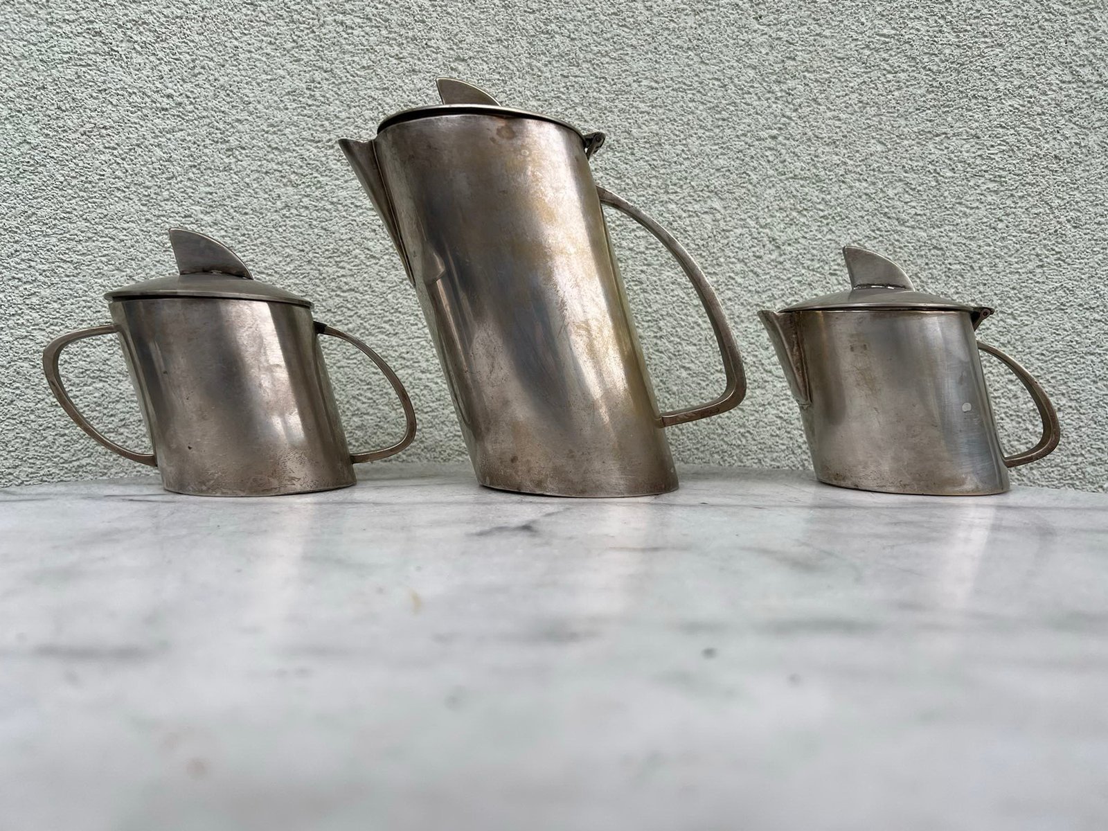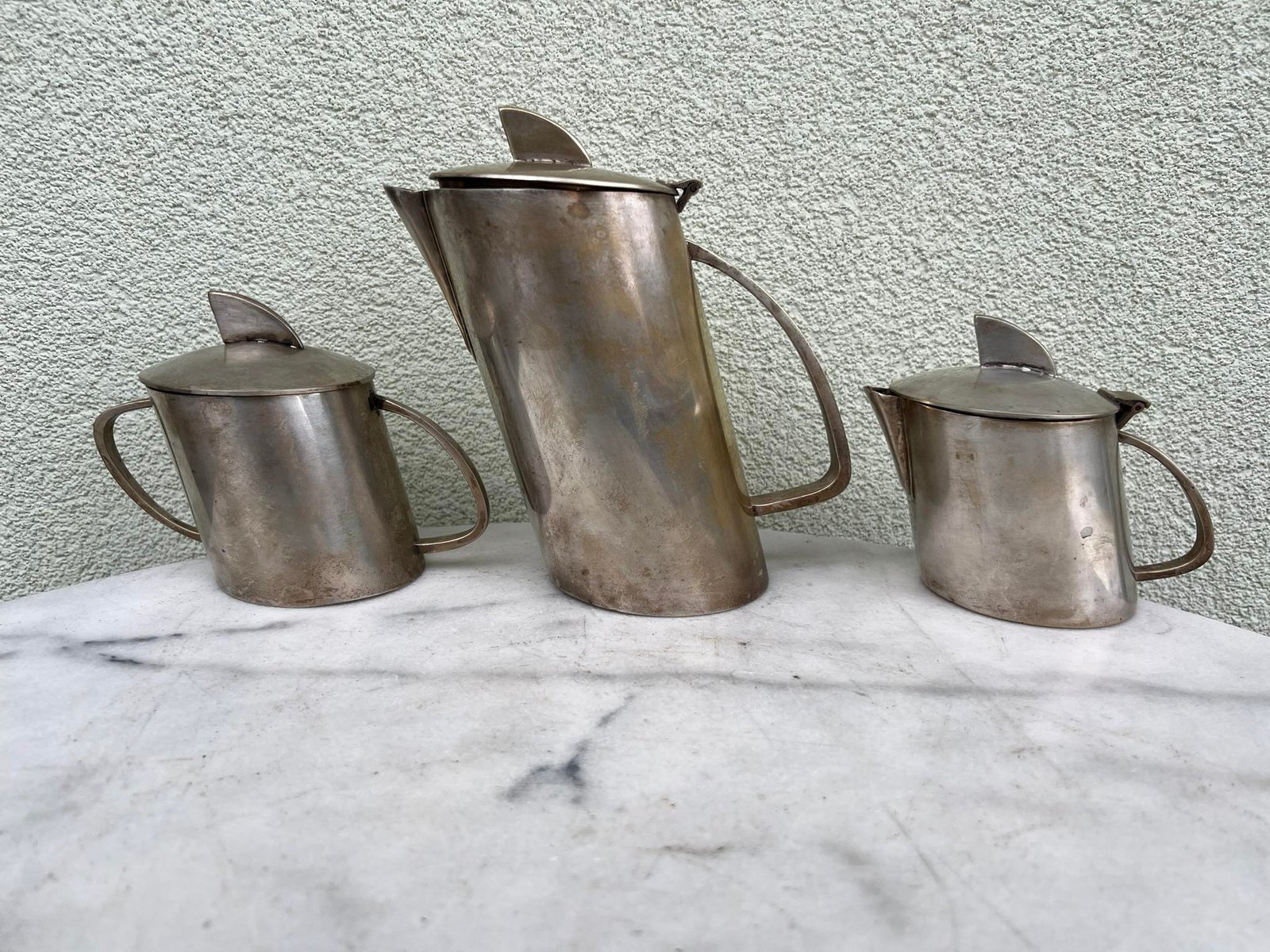 Komplektas Art Deco stiliaus, antikvarinis, nestandartinės formos. Kavinukas, arbatinukas, cukrinė, indas pienui, grietinėlei. Kaina 138