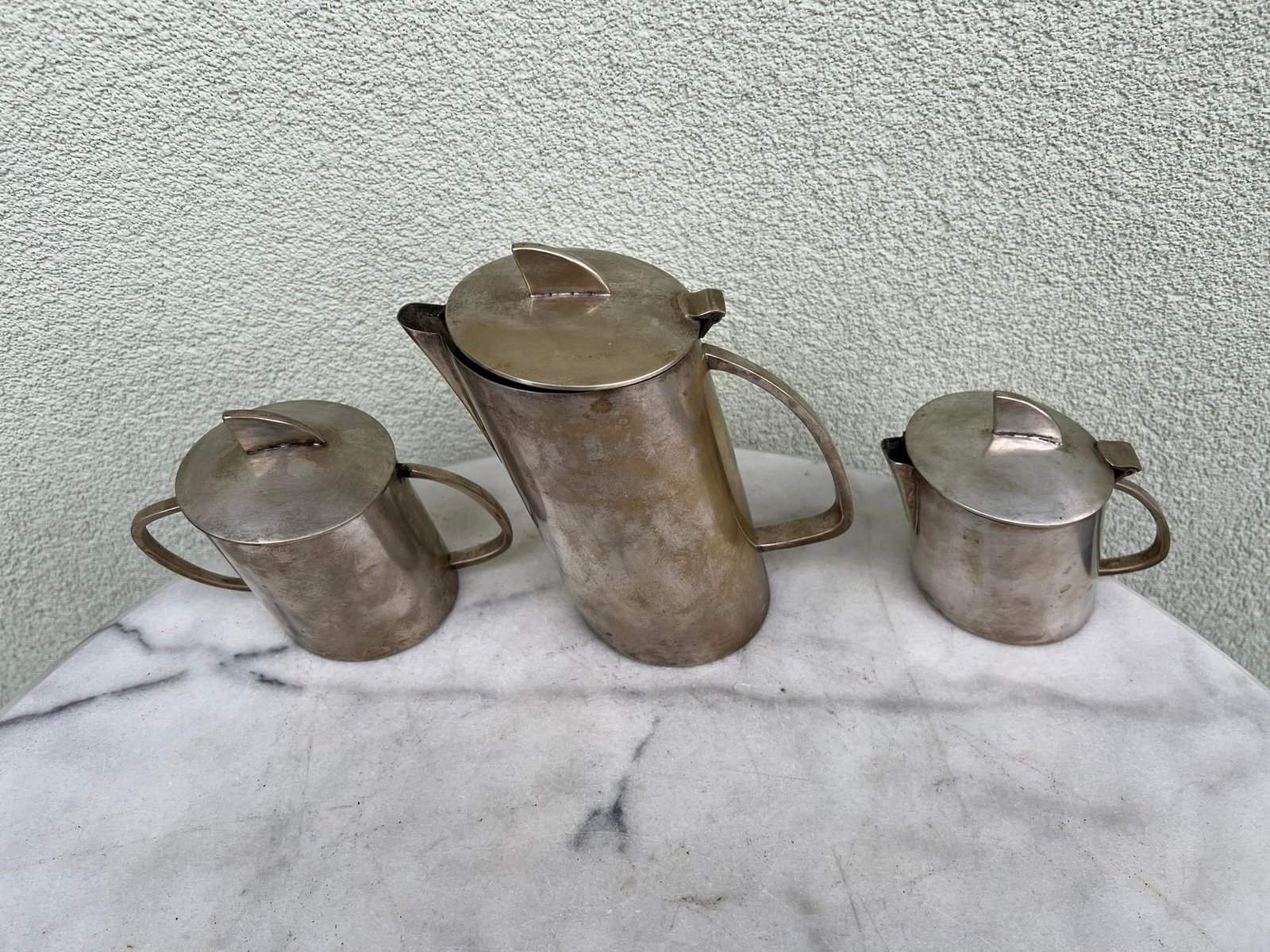 Komplektas Art Deco stiliaus, antikvarinis, nestandartinės formos. Kavinukas, arbatinukas, cukrinė, indas pienui, grietinėlei. Kavinuko aukštis 18 cm. Kaina 138