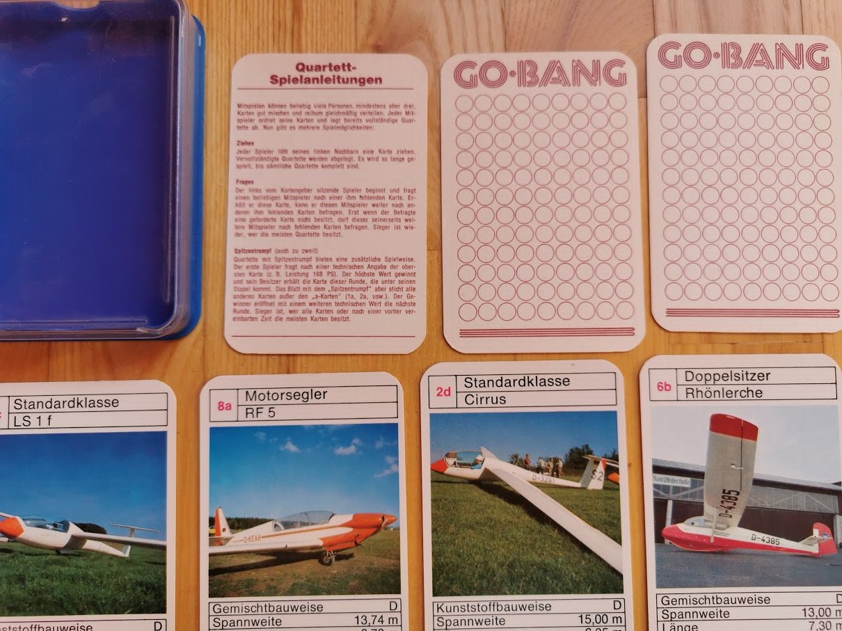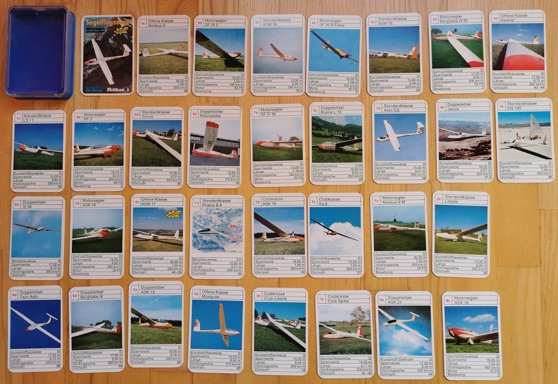 Collectible Vintage PLAINS Cards. ASS Deutsche Auto-Asse SEGELFLUGZEUGE Quartett. Cards game. Made in Germany. Used but in good condition. Original. Full set, 32 cards. Card size: 7 x 10 cm.
