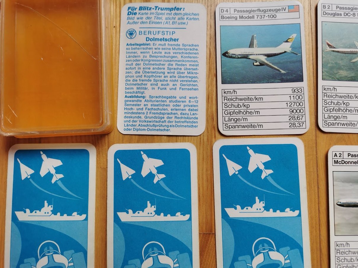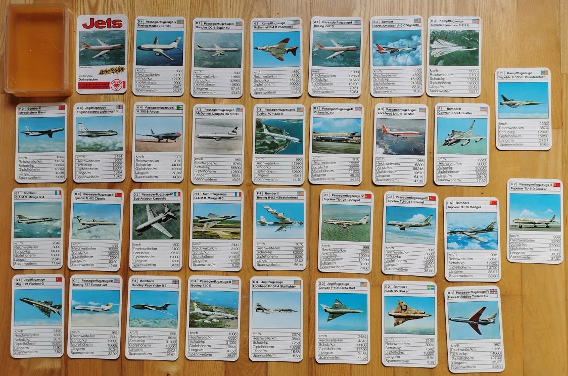Collectible Vintage PLAINS JETSCards. ASS Deutsche Auto-Asse JETS Quartett. Cards game. Made in Germany. Used but in good condition. Original. Full set, 32 cards. Card size: 7 x 10 cm.