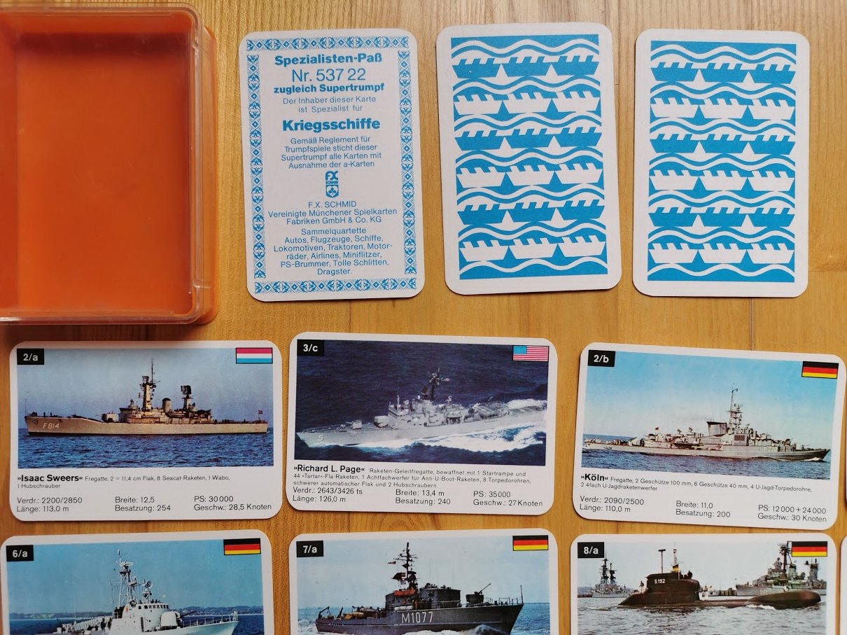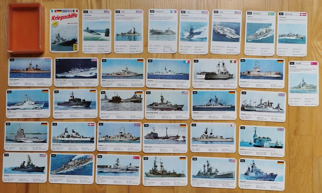 Collectible Vintage WAR SHIPS Cards. ASS Deutsche Auto-Asse KRIEGSSCHIFFE Quartett. Cards game. Made in Germany. Used but in good condition. Original. Full set, 32 cards. Card size: 7 x 10 cm.